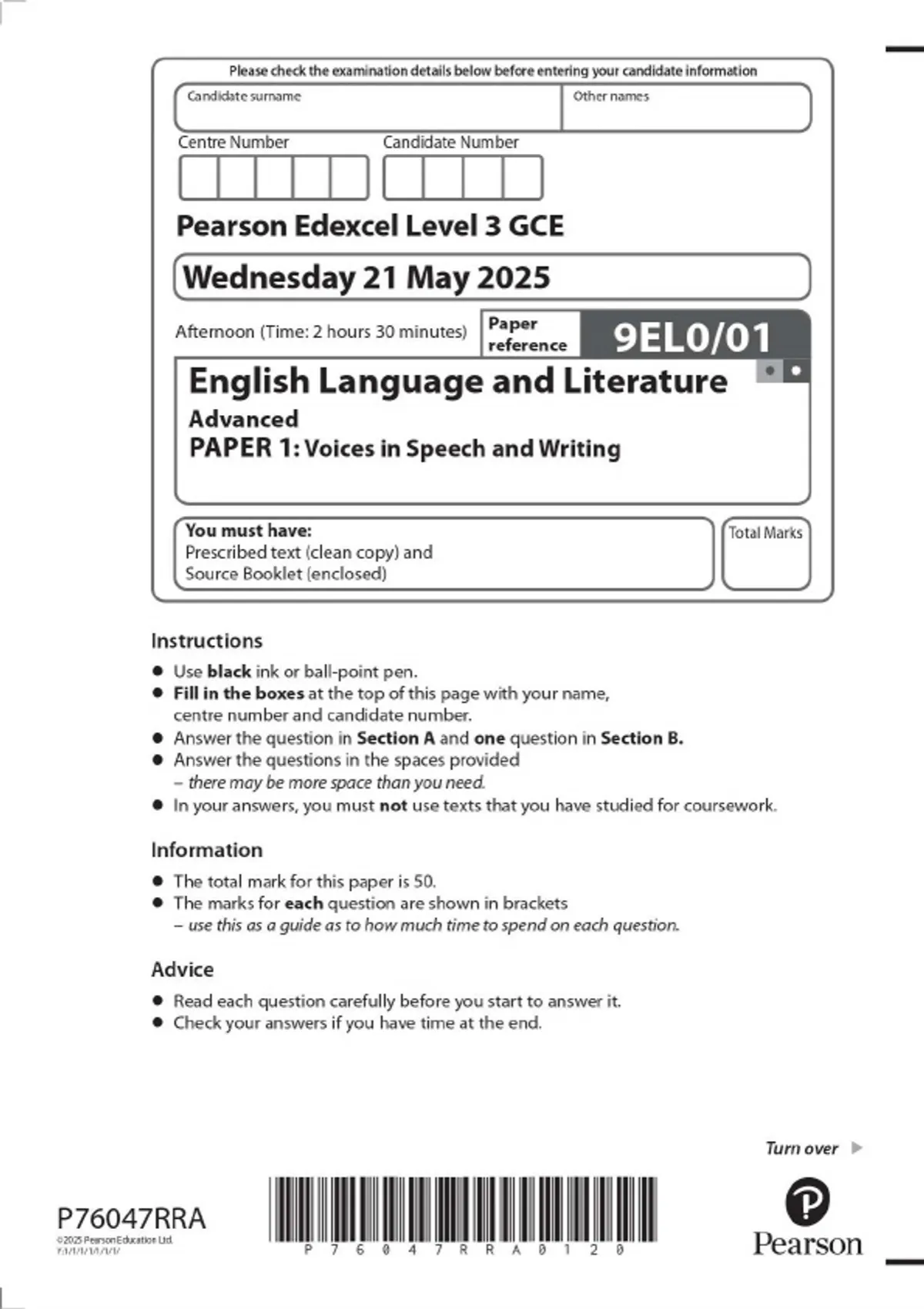 Pearson Edexcel Level 3 GCE English Language and Literature Advanced PAPER 1: Voices in Speech and Writing 2025 Combined Question Paper and Mark Scheme