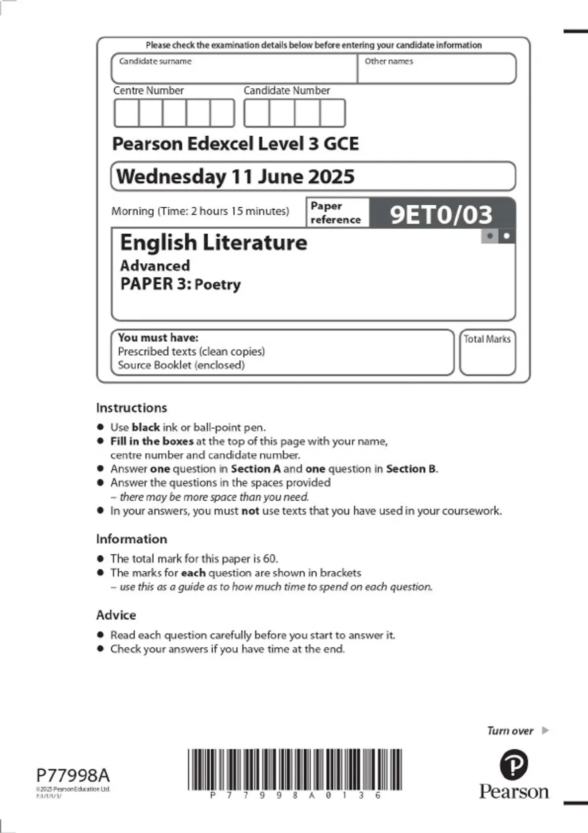 Pearson Edexcel Level 3 GCE English Literature Advanced PAPER 3: Poetry2025 Combined Question Paper and Mark Scheme