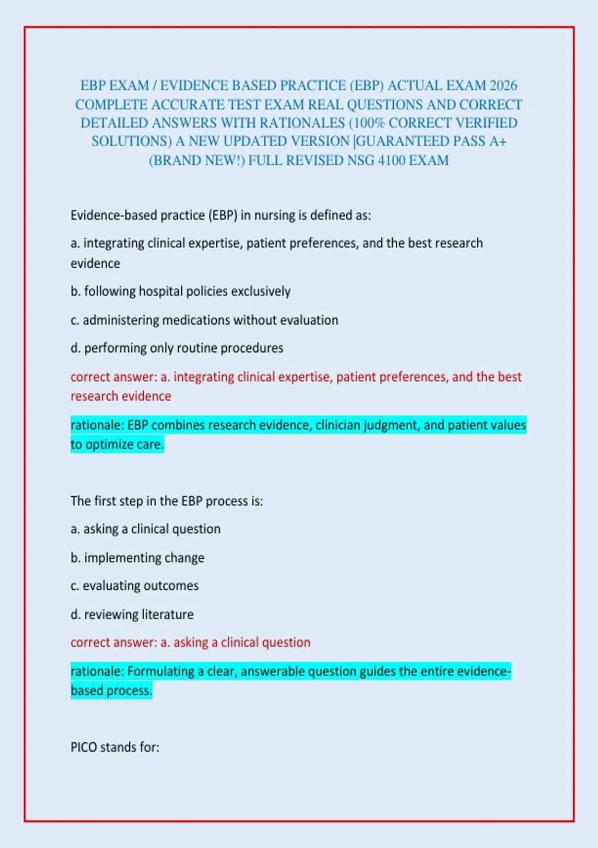 EBP EXAM / EVIDENCE BASED PRACTICE (EBP) ACTUAL EXAM 2026 COMPLETE ACCURATE TEST EXAM REAL QUESTIONS AND CORRECT DETAILED ANSWERS WITH RATIONALES (100% CORRECT VERIFIED SOLUTIONS) A NEW UPDATED VERSION |GUARANTEED PASS A+ (BRAND NEW!) FULL REVISED NSG 4100 EXAM