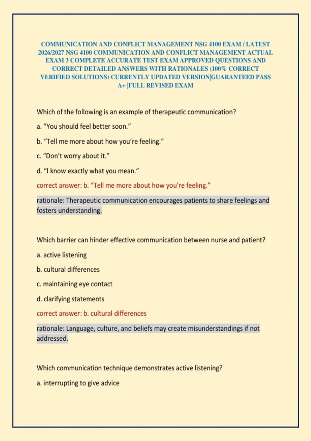 COMMUNICATION AND CONFLICT MANAGEMENT NSG 4100 EXAM / LATEST 2026/2027 NSG 4100 COMMUNICATION AND CONFLICT MANAGEMENT ACTUAL EXAM 3 COMPLETE ACCURATE TEST EXAM APPROVED QUESTIONS AND CORRECT DETAILED ANSWERS WITH RATIONALES (100% CORRECT VERIFIED SOLUTION