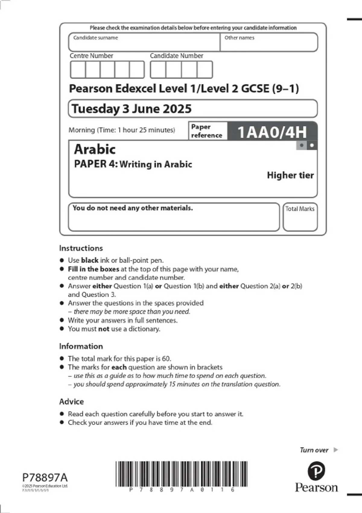 Pearson Edexcel Level 1/Level 2 GCSE (9–1) Arabic PAPER 4: Writing in Arabic Higher tier 2025 combined Question Paper and Mark scheme