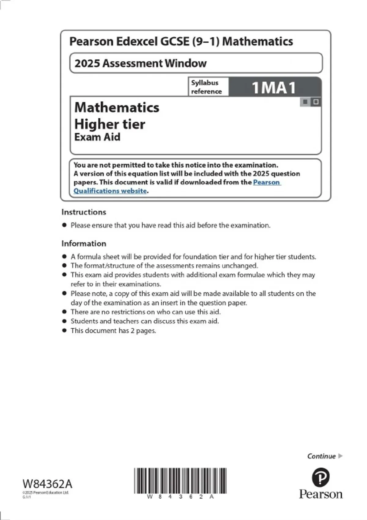 Pearson Edexcel GCSE (9–1) Mathematics 2025 Assessment Window Syllabus reference Mathematics Higher tier 1MA1 Exam Aid