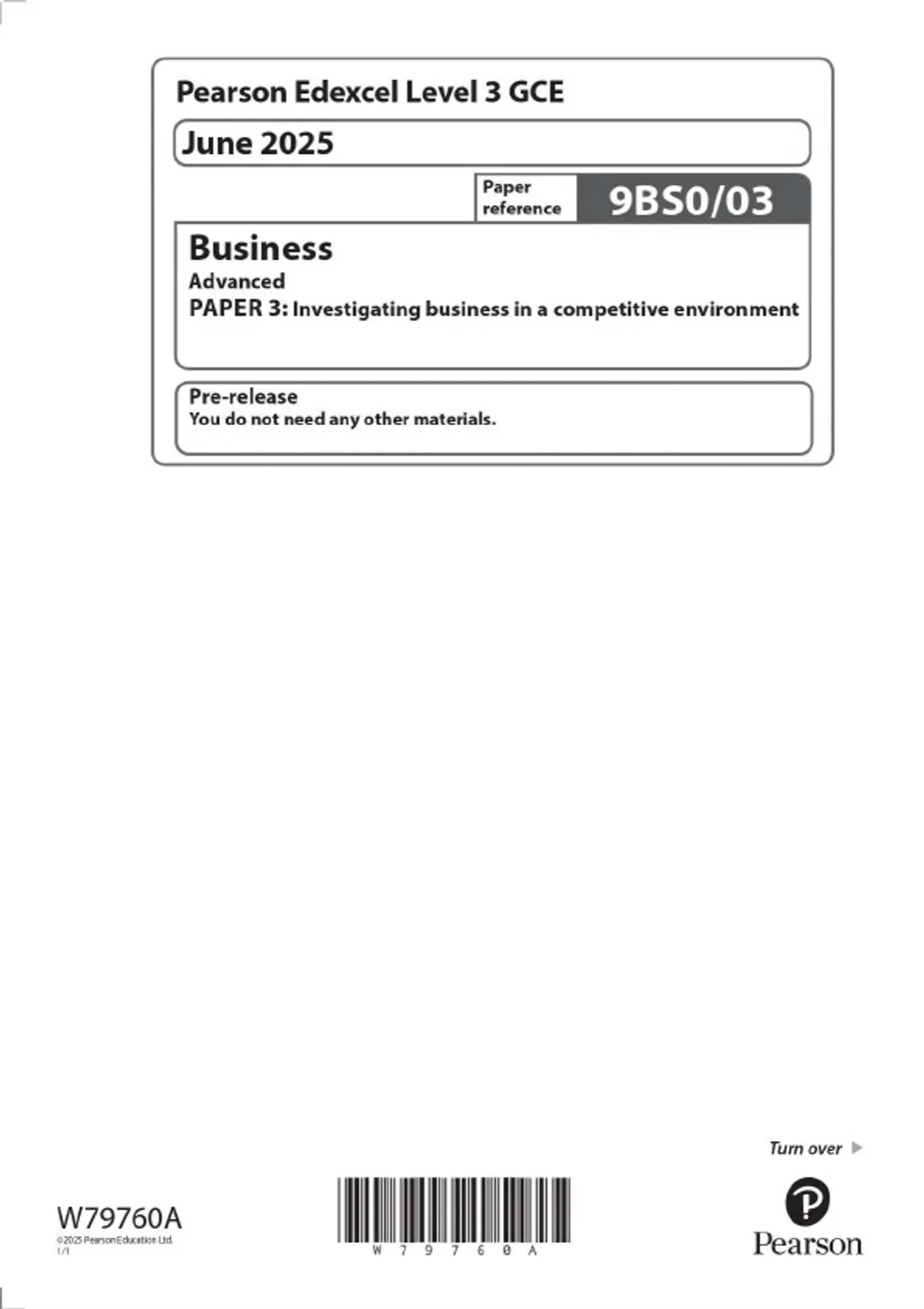 Pearson Edexcel Level 3 GCE June 2025 Paper reference 9BS0/03 Business Advanced PAPER 3: Investigating business in a competitive environment