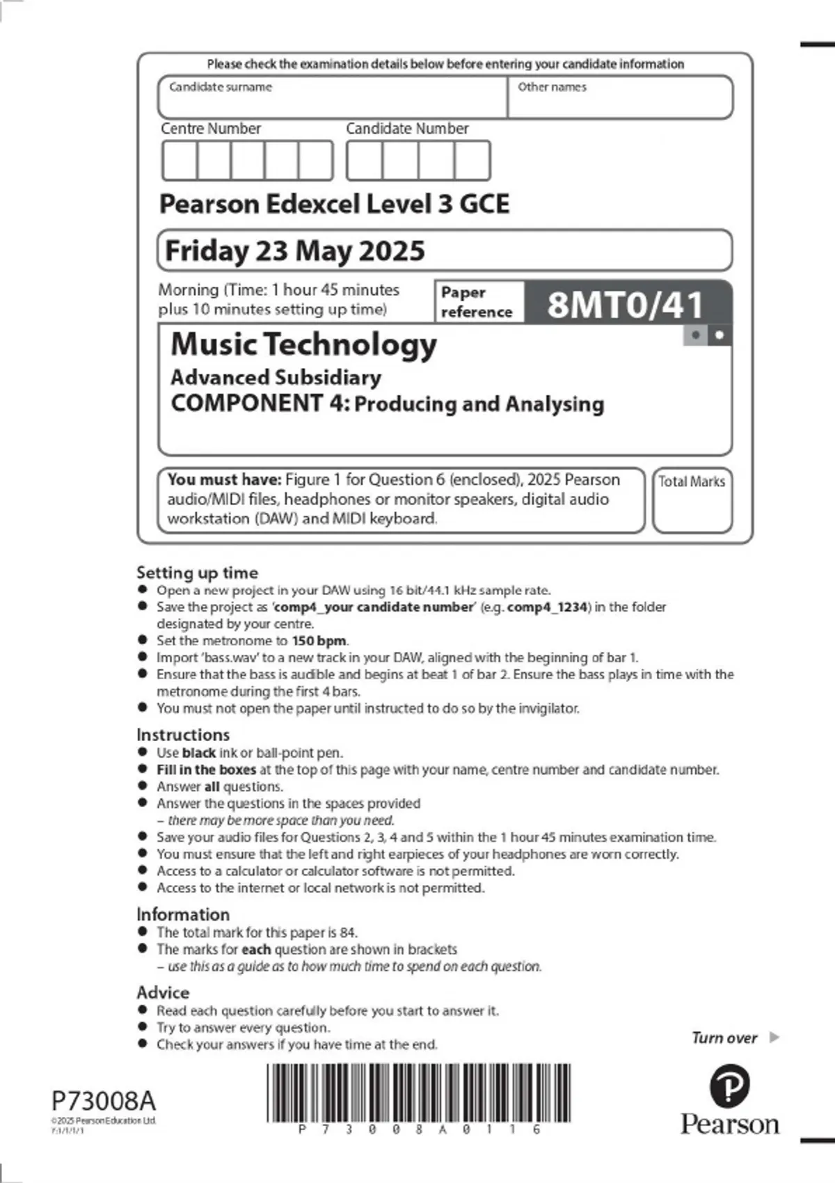 Pearson Edexcel Level 3 GCE Music Technology Advanced Subsidiary COMPONENT 4: Producing and Analysing MAY 2025 combined Question Paper and Mark scheme
