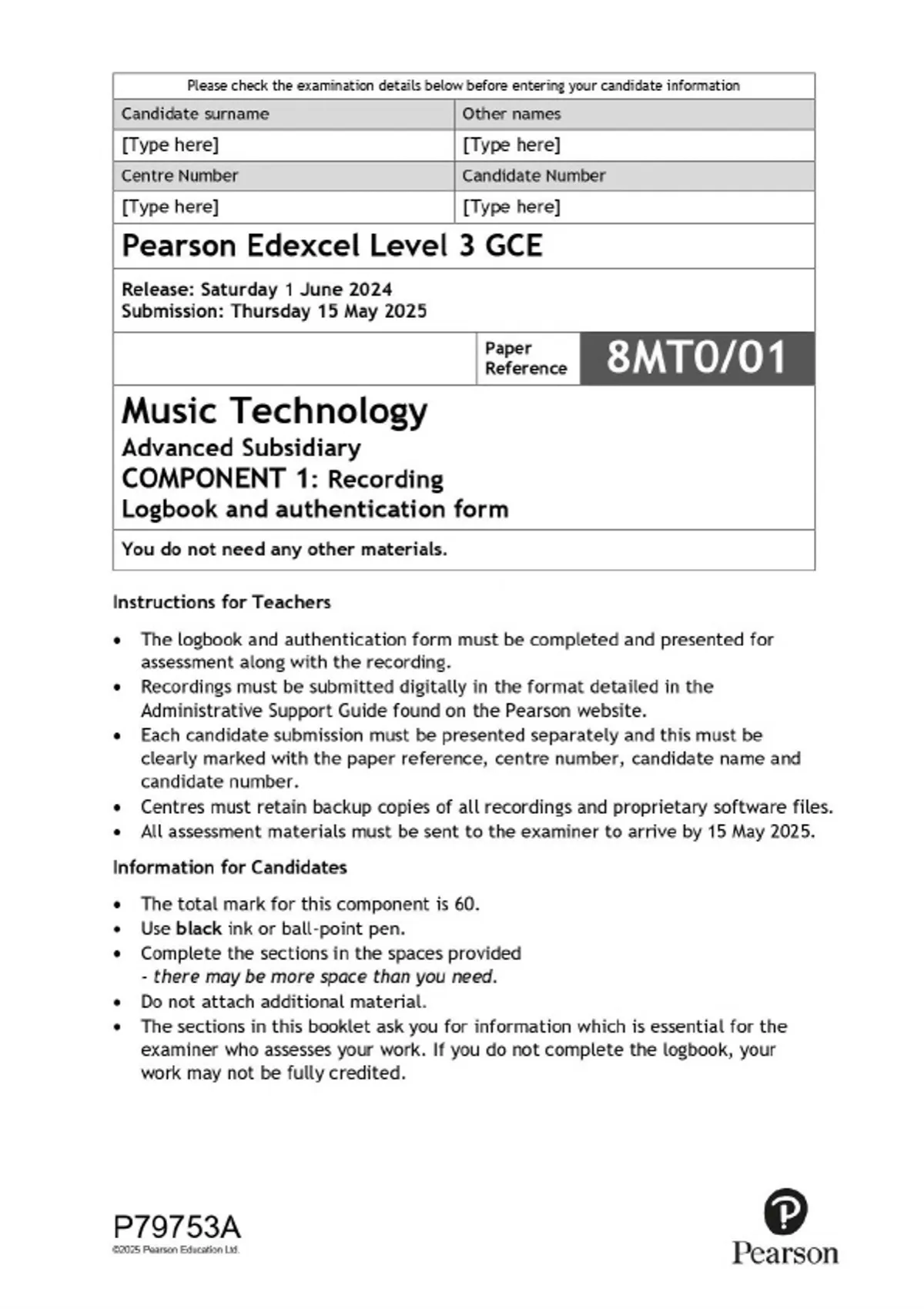 Music Technology 8MT0/01 Advanced Subsidiary COMPONENT 1: Recording Logbook and authentication form