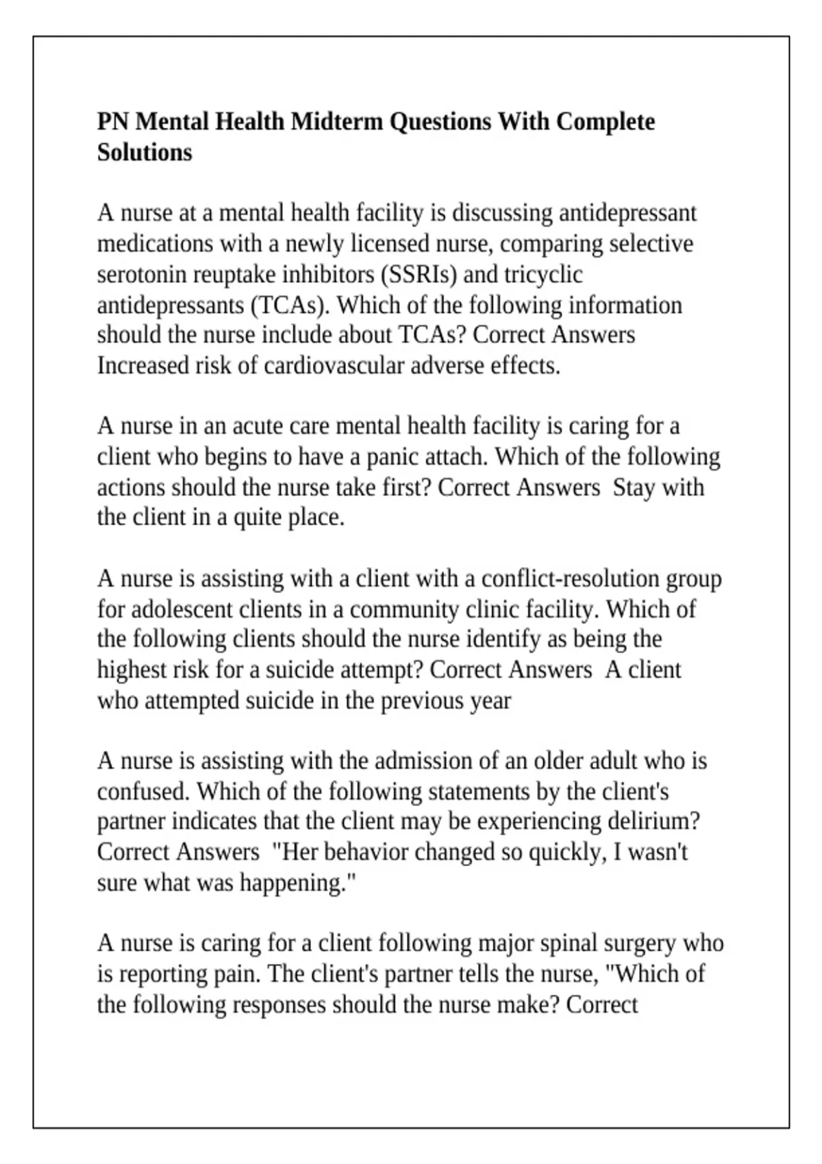 PN Mental Health Midterm Questions With Complete