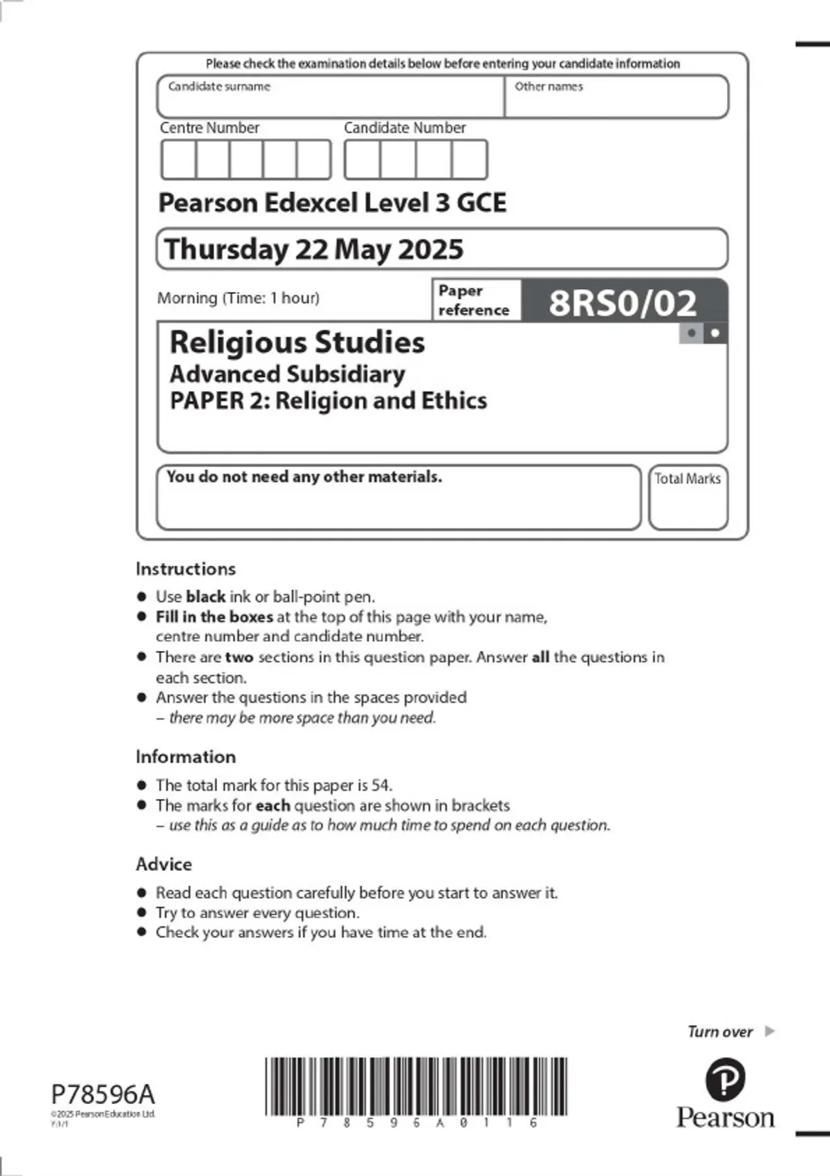 Pearson Edexcel Level 3 GCE Religious Studies Advanced Subsidiary PAPER 2: Religion and Ethics JUNE 2025 Combined Question Paper and Mark Scheme