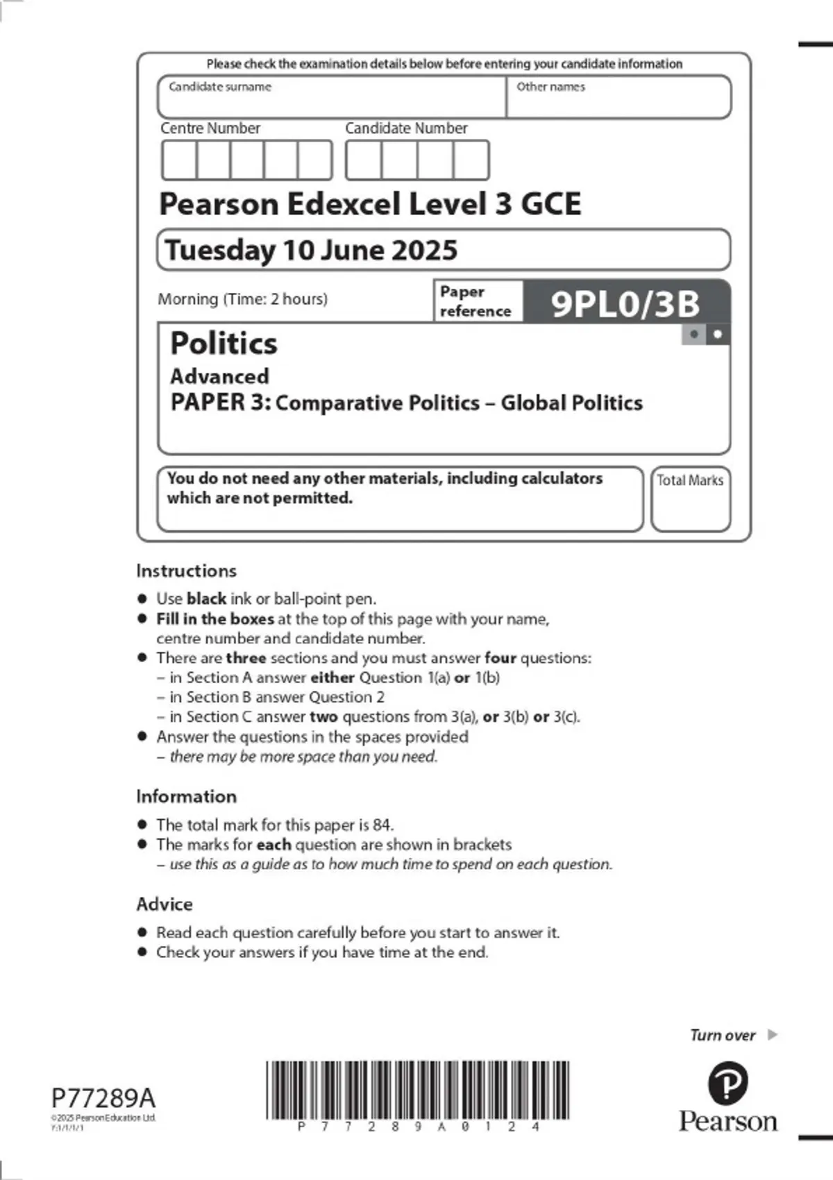 Pearson Edexcel Level 3 GCE Politics Advanced PAPER 3: Comparative Politics – Global Politics 2025 Combined Question Paper and Mark Scheme