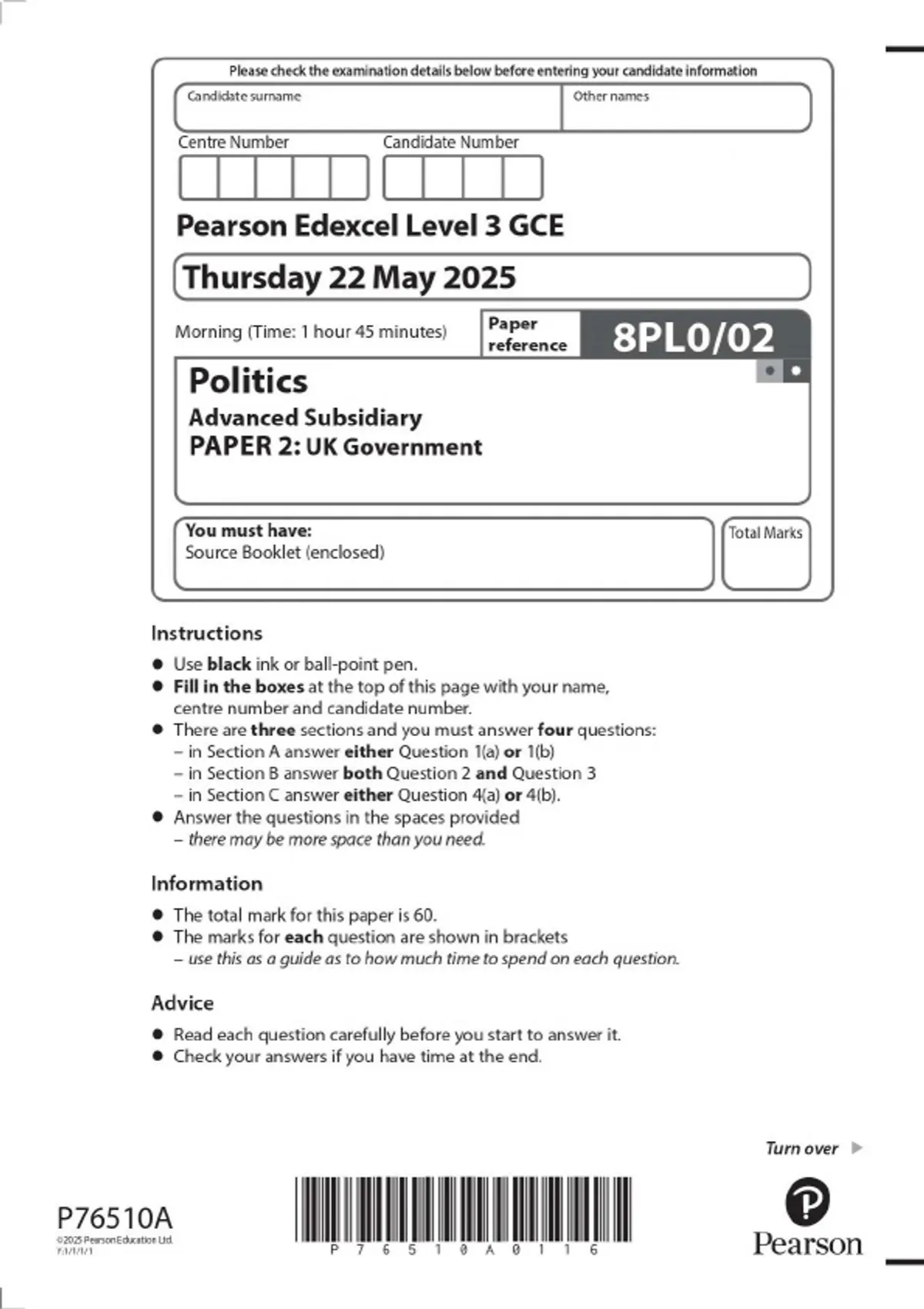 Pearson Edexcel Level 3 GCE Politics Advanced Subsidiary PAPER 2: UK Government MAY 2025 Combined Question Paper and Mark Scheme