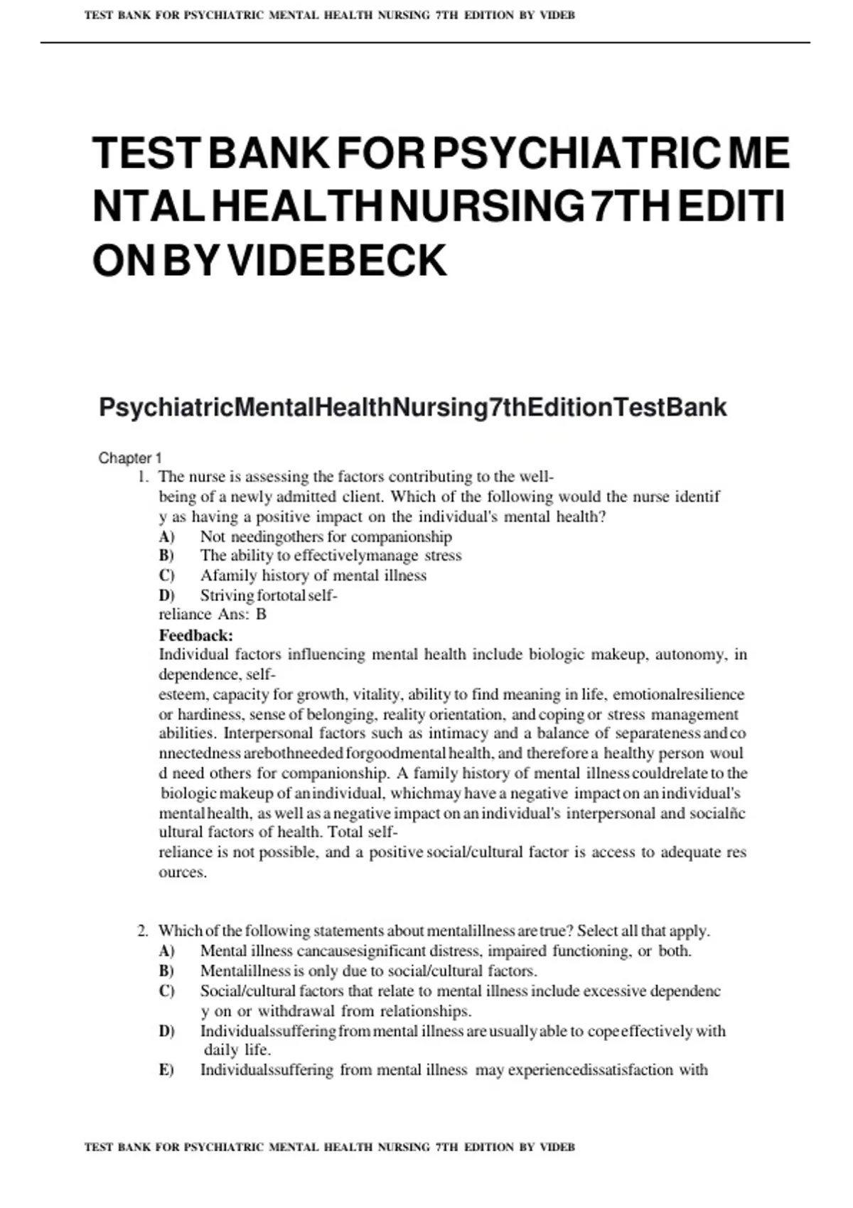, TEST!*BANK!*FOR!*PSYCHIATRIC!*MENTAL!*HEALTH!*NURSING!*7TH!*EDITION!*BY!*VIDEB