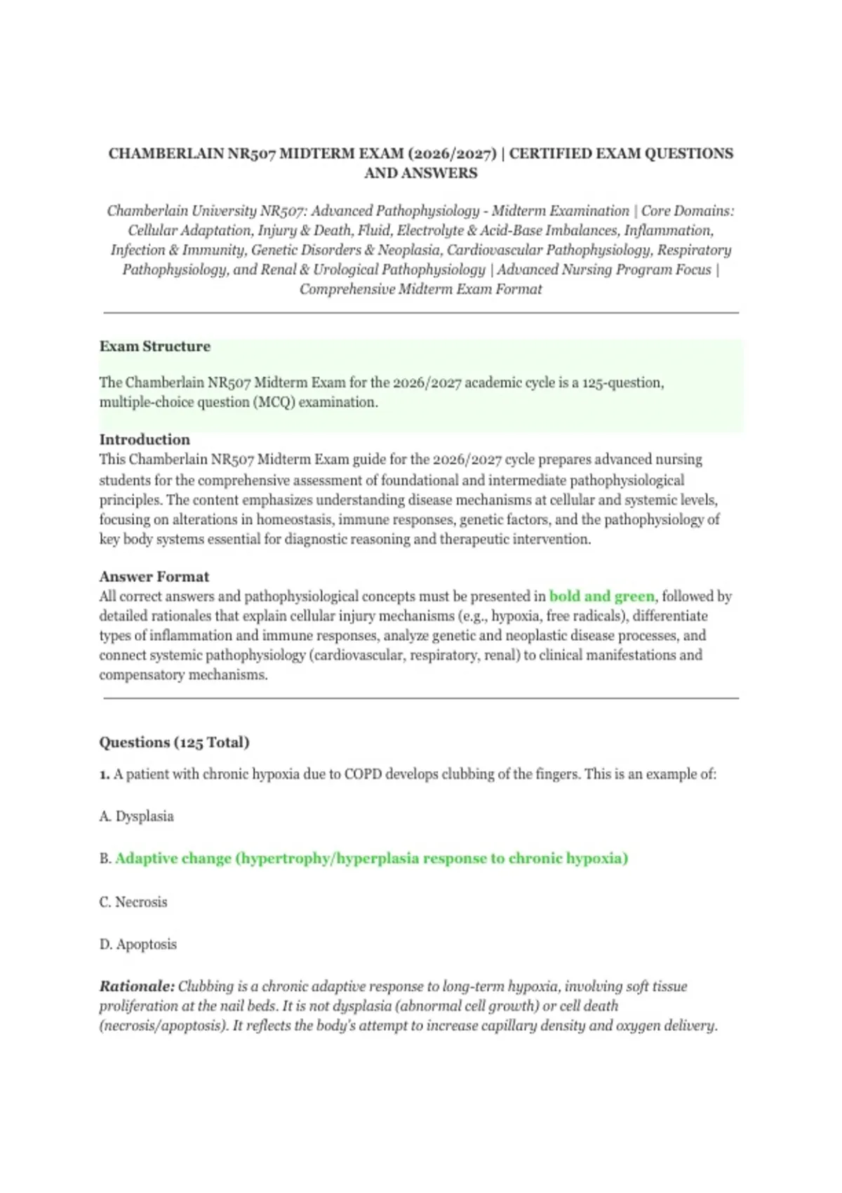 Prepare for the Chamberlain University NR507 Advanced Pathophysiology midterm exam with the latest 2026/2027 guide. Features certified exam questions and answers covering cellular injury, fluid/electrolyte balance, inflammation, genetics, cardiovascular, respiratory, and renal pathophysiology—essential for advanced nursing success.