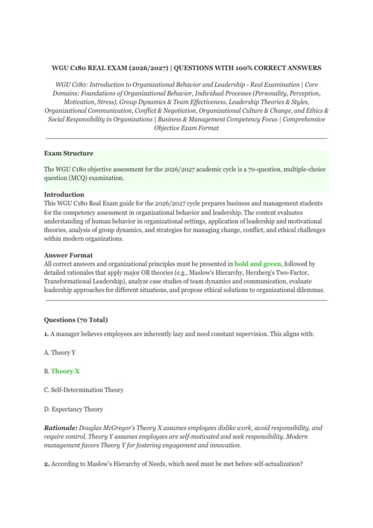 Prepare for the WGU C180 Introduction to Organizational Behavior and Leadership real exam with the latest 2026/2027 guide. Features exam questions with 100% correct answers covering organizational behavior, motivation, team dynamics, leadership, communication, conflict, culture, change, and ethics—essential for business competency success.