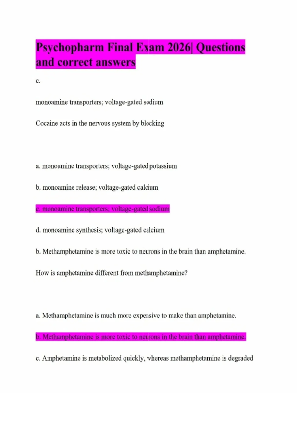 Psychopharm Final Exam 2026| Questions and correct answers c. monoamine transporters; voltage-gated sodium Cocaine acts in the nervous system by blocking a. monoamine transporters; voltage-gated potassium b. monoamine release; voltage-gated calcium c. monoamine transporters; voltage-gated sodium d. monoamine synthesis; voltage-gated calcium b. Methamphetamine is more toxic to neurons in the brain than amphetamine. How is amphetamine different from methamphetamine? a. Methamphetamine is much more expensive to make than amphetamine. b. Methamphetamine is more toxic to neurons in the brain than amphetamine. c. Amphetamine is metabolized quickly, whereas methamphetamine is degradedslowly. d. Methamphetamine users frequently go on binges or "runs" of IV use; this is rare with amphetamine users. c. releasing dopamine from vesicles into the cytoplasm Amphetamine and methamphetamine affect synaptic transmission by a. increasing catecholamine reuptake b. increasing metabolism by MAO c. releasing dopamine from vesicles into the cytoplasm d. shutting down the dopamine transporter e. All of the above b. resemble the neurotransmitter DA in their chemical structure. Amphetamine and related psychostimulants in the amphetamine-like family a. are drugs of the twentieth century, having no use prior to 1900. b. resemble the neurotransmitter DA in their chemical structure.c. are drugs of abuse with no therapeutic value. d. are all synthetic. c. It results from continuous drug infusion. Which of the following regarding sensitization to psychostimulants is false? a. Its expression involves enhanced dopamine activity in the VTA → nucleus accumbens pathway. b. It can be divided into two phases, induction and expression. c. It results from continuous drug infusion. d. Glutamate from the medial prefrontal cortex plays a role. b. Use was successfully banned by Spanish rulers in South America Which of the following does not describe cocaine?