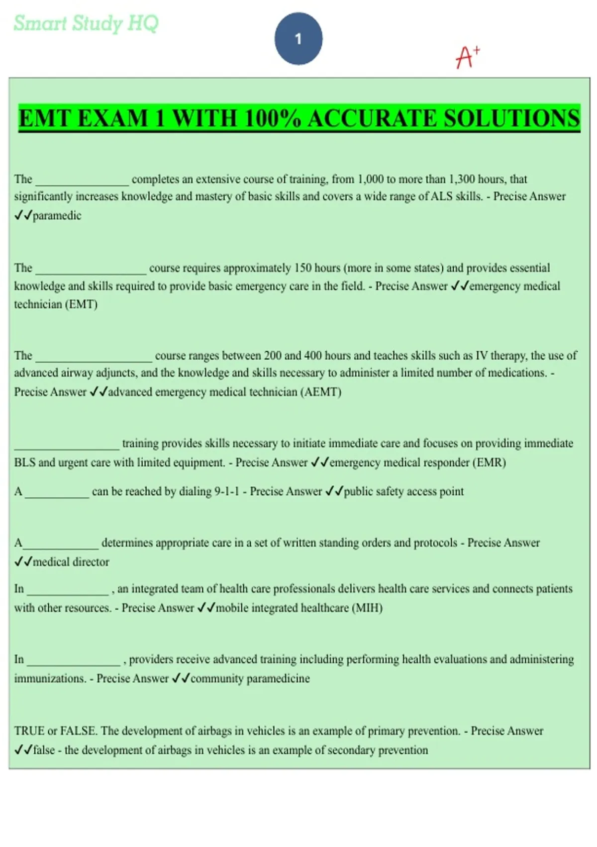 This document contains a full set of EMT Exam 1 practice questions with precise, 100% accurate answers covering foundational EMT-B topics. It includes EMS systems, legal and ethical responsibilities, communication, documentation, patient consent, anatomy and physiology, lifting and moving patients, stress management, infection control, and age-related patient considerations. The material is well suited for exam preparation and review, reflecting core content aligned with national EMT education standards.