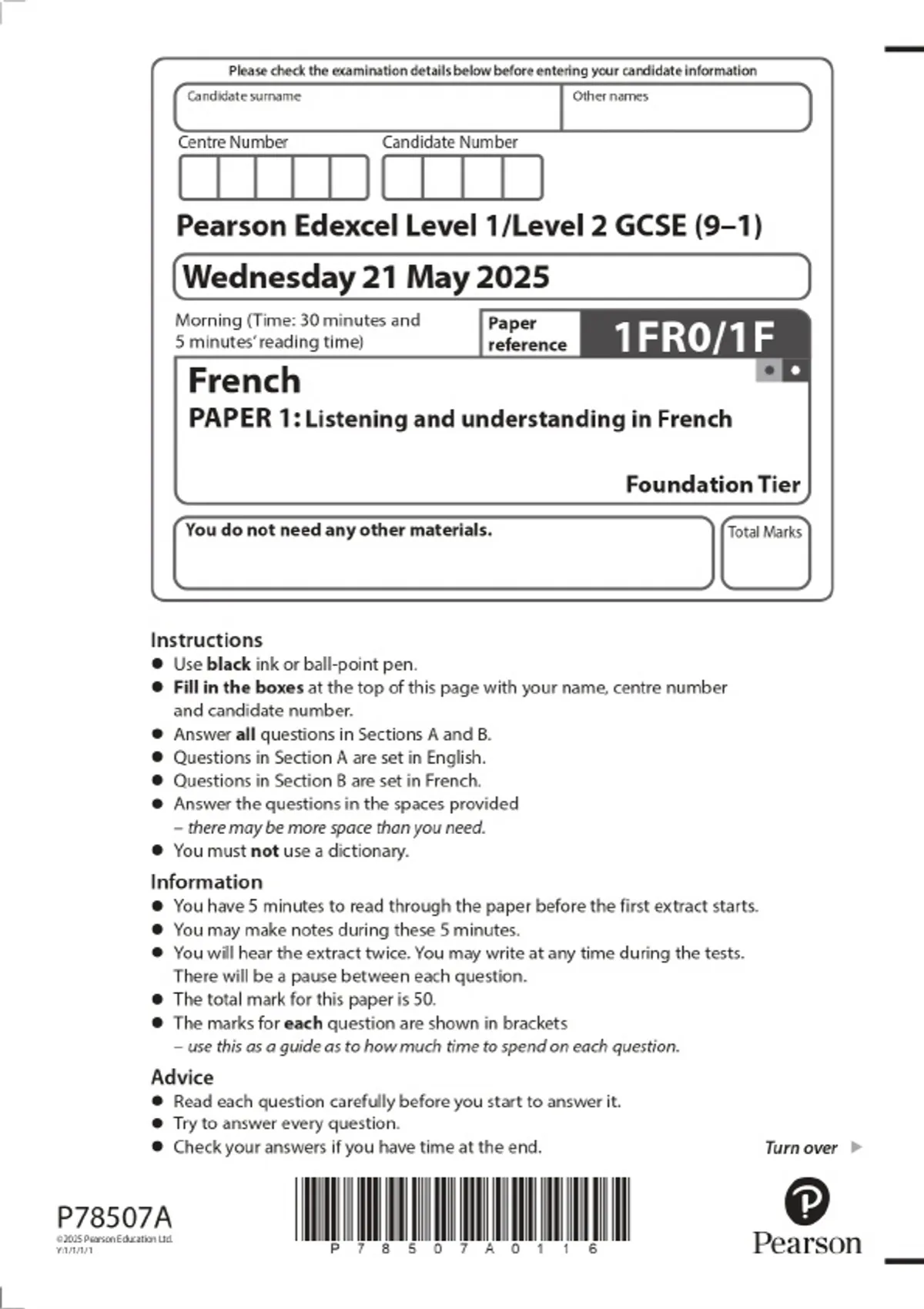 2025 Pearson Edexcel Level 1/Level 2 GCSE (9–1) French PAPER 1: Listening and understanding in French Foundation Tier Combined Question Paper and Marking Scheme