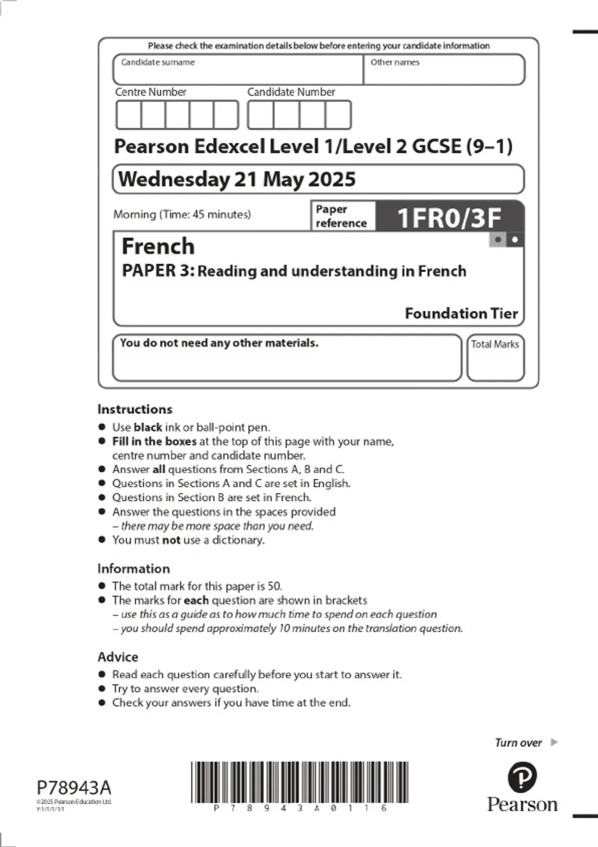 2025 Pearson Edexcel Level 1/Level 2 GCSE (9–1) French PAPER 3: Reading and understanding in French Foundation Tier Combined Question Paper and Marking Scheme