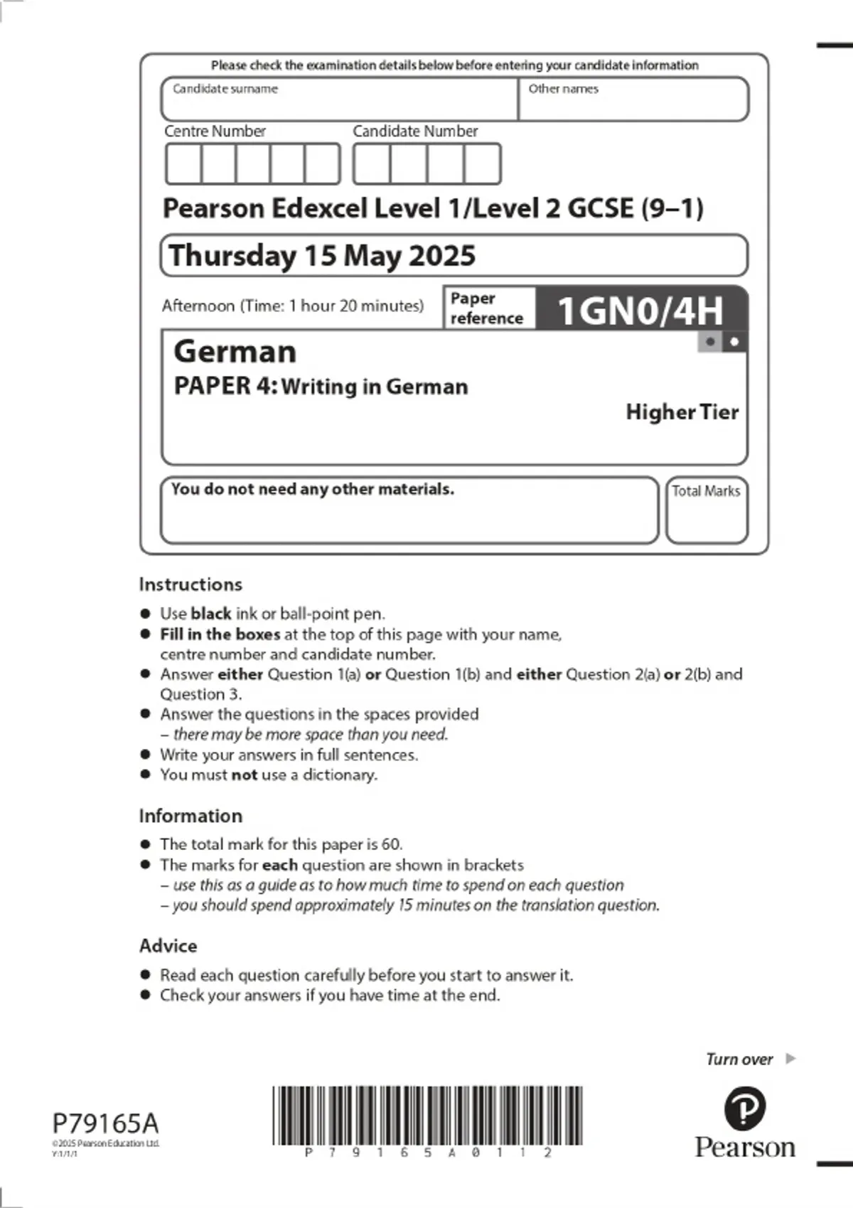 2025 Pearson Edexcel Level1/Level 2 GCSE (9–1) German PAPER 4: Writing in German Higher Tier Combined Question Paper and Marking Scheme