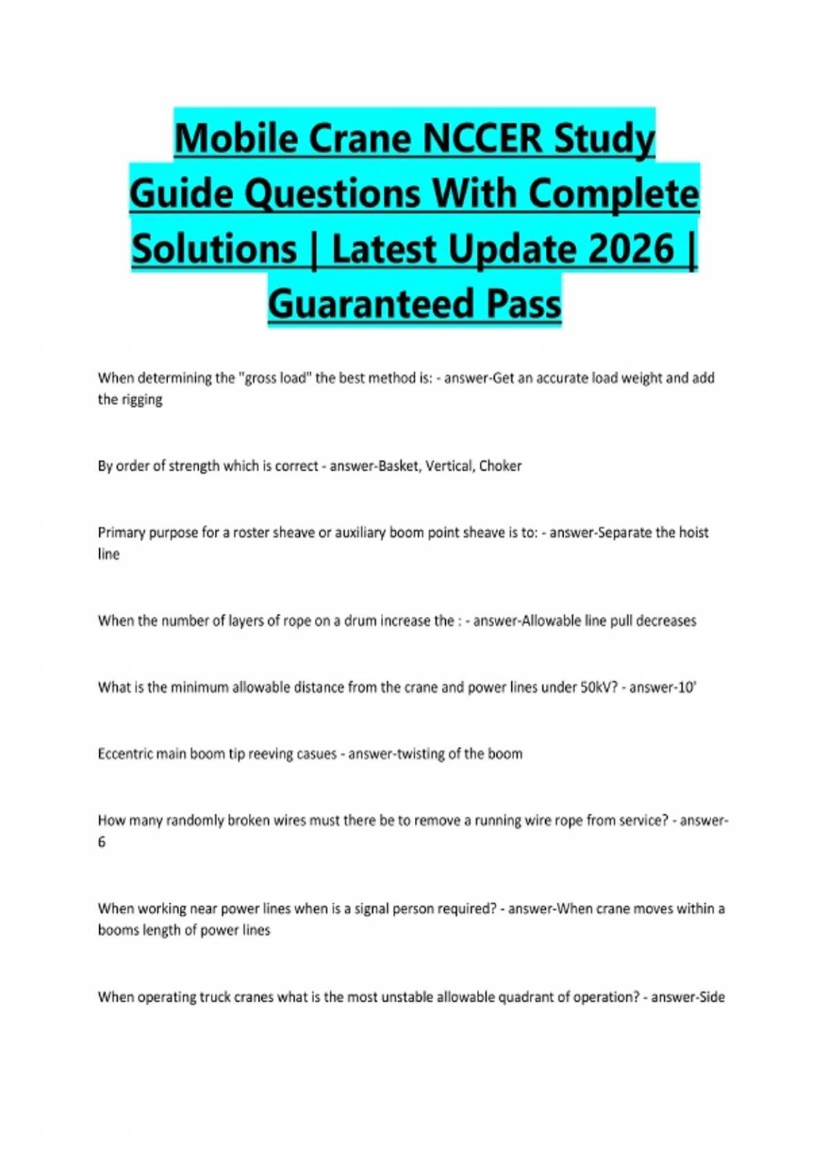 Mobile Crane NCCER Study Guide Questions With Complete Solutions | Latest Update 2026 | Guaranteed Pass When determining the "gross load" the best method is: - answer-Get an accurate load weight and add the rigging By order of strength which is correct - answer-Basket, Vertical, Choker Primary purpose for a roster sheave or auxiliary boom point sheave is to: - answer-Separate the hoist line When the number of layers of rope on a drum increase the : - answer-Allowable line pull decreases What is the minimum allowable distance from the crane and power lines under 50kV? - answer-10' Eccentric main boom tip reeving casues - answer-twisting of the boom How many randomly broken wires must there be to remove a running wire rope from service? - answer- 6 When working near power lines when is a signal person required? - answer-When crane moves within a booms length of power lines When operating truck cranes what is the most unstable allowable quadrant of operation? - answer-SideTipping capacities of locomotive cranes are based on what % of tipping? - answer-85% Should the load be applied when determining the proper boom angle? - answer-YES What type of rope is recommended for a tagline around powerlines - answer-Polypropylene what does two beeps of the horn indicate to people in the area - answer-forward Load radius is the distance from the center of gravity of the suspended load to the: - answer-Center of rotation What is the purpose of using a boom extension? - answer-Increase height What do a jib and boom ext. have in common - answer-Increase height What is the minimum design factor required for a right regular lay main boom or auxiliary hoist rope?` - answer-3.5 How does the operator determine if the correct load chart is being used? - answer-Matching serial numbers If the crane's jib is offset 5 degrees as opposed to an original 15 degrees and the boom angle remains constant you would expect the load radius to do what? - answer-To be reduced How does the operator verify the LMs boom length or load radius reading? - answer-accutal measurements If the rated capacity of the crane is above the solid line or within the shaded areas or has an asterisk next to it this means the capacity is based on: - answer-85% tippingHow many broken wires must be present in one strand of one lay for running wire rope to be removed from service? - answer-3 In a range diagram boom length and angle can be used to determine: - answer-Load radius When making a multiple crane lift it is important for the operator to understand that - answer-the weight may increase if the other crane lands the load first Most crane manufacturers reduce the load capacity for duty-cycle operations because - answer-side loading forces may occur The proper way to calibrate a boom angle indicator is: - answer-using a level, raise the boom to horizontal and set the indicator at 0 degrees If setting up the crane by a ditch or an excavation, you should stay at least what distance from the edge? - answer-1 1/2 times the depth of the excavation When using cable or nylon spreaders it is important to remember : - answer-the lower the spreader angle the greater the tension Backward stability is tested with - answer-Basic boom at maximum angle with no load If the rated capacity of the crane is below the solid line or outside the shaded area or has an asterisk next to it this means the capacity is based on - answer-Tipping Parts of line means - answer-the number of lines running through the load block If a jib is erected but not being used, it is treated as deduction from the crane's - answer-Gross capacity What are most jib capacities based on? - answer-Structural