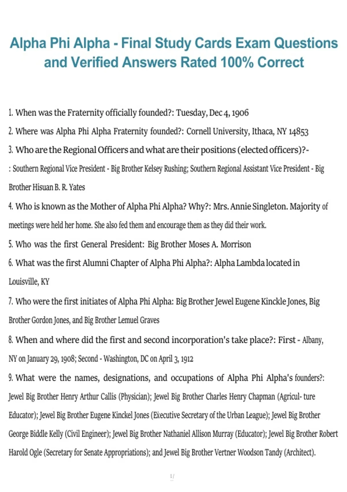 This final study cards exam resource for Alpha Phi Alpha includes concise, exam-focused questions with fully verified, 100% correct answers for the 2026/2027 update. It covers essential fraternity knowledge such as history, founders, guiding principles, organizational structure, traditions, protocols, and core values, making it ideal for efficient review and final exam preparation.
