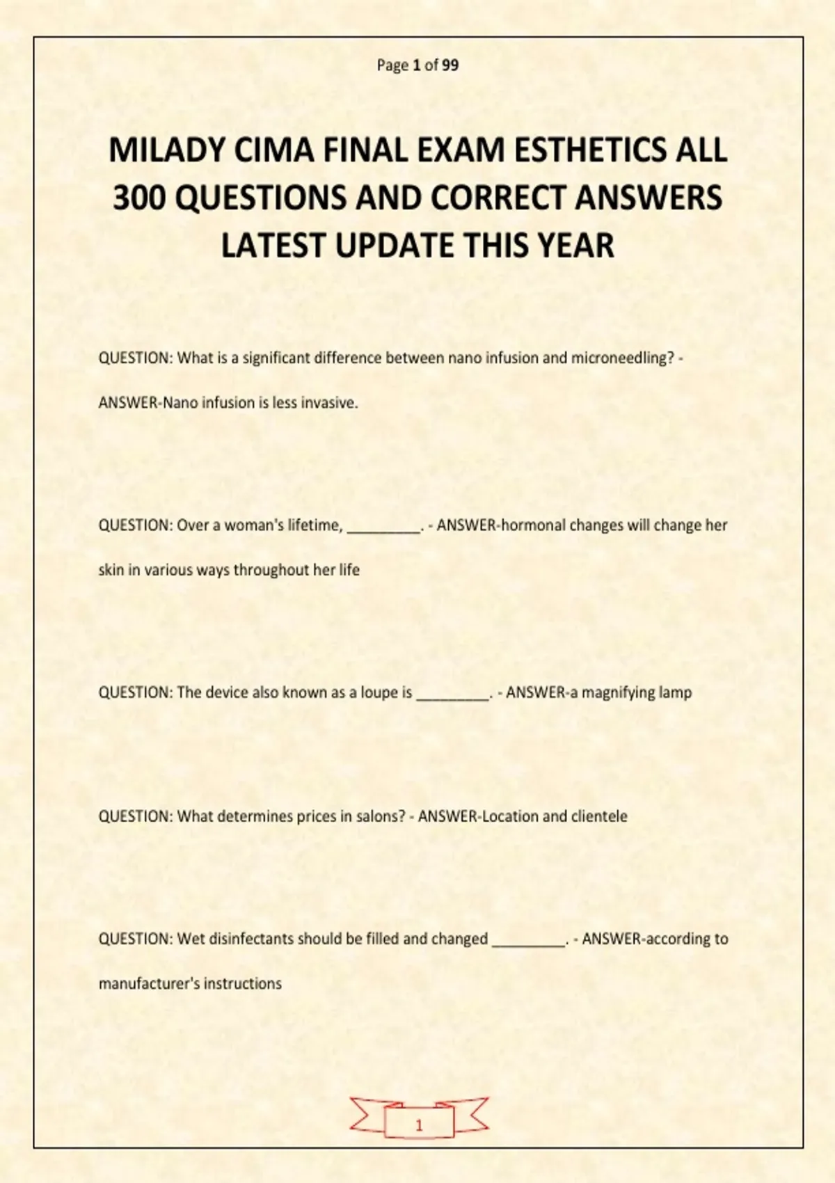 Tap on AVAILABLE IN BUNDLE / PACKAGE DEAL to unlock free bonus exams — save more while getting everything you need! You’ll be glad you did! Milady CIMA Final Exam (Cosmetology & Haircutting Actual Exam 2026–2027) – Complete 400 Questions and Verified Solutions (Latest Update This Year) delivers a fully updated and comprehensive study resource designed to help candidates confidently prepare for the Milady CIMA Final Exam in cosmetology and haircutting. This in-depth exam guide covers all essential cosmetology knowledge and practical skills required for licensure, including haircutting principles and techniques, hair structure and chemistry, scalp and hair analysis, styling and finishing techniques, hair coloring and chemical services, sanitation and safety practices, client consultation, salon operations, and professional ethics. The complete set of 400 questions mirrors real exam formats and scenario-based challenges, allowing candidates to strengthen both theoretical understanding and hands-on technical application. Each question is paired with a verified solution to reinforce learning, clarify complex cosmetology concepts, and enhance exam readiness. Ideal for cosmetology students, hair professionals, educators, and candidates preparing for the Milady CIMA Final Exam, this resource ensures comprehensive review, practical practice, and confident performance on exam day.
