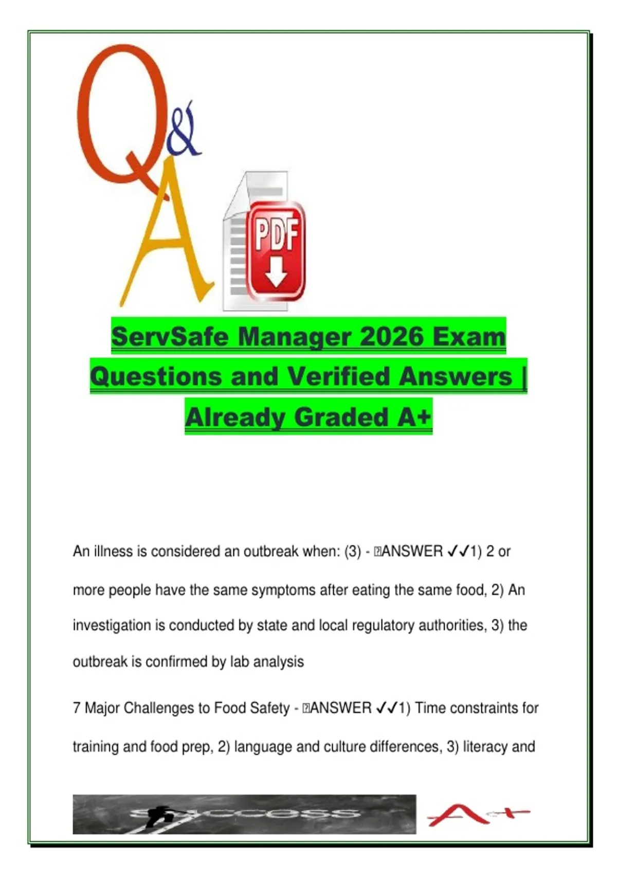 This expertly verified study guide for the ServSafe Manager Certification Exam 2026 contains over 100 multiple-choice questions and answers based on the official ServSafe Manager Book 7th Edition, offering clear and concise preparation for food service managers and supervisors. Each question reflects real exam scenarios and includes the correct answer with detailed rationale, helping learners understand not only what the correct choice is, but why it’s correct. The material is aligned with FDA Food Code guidelines and current industry best practices. Topics covered include: – Types of foodborne illnesses and biological, chemical, and physical contaminants – Time and temperature control (TCS foods) – Cross-contamination prevention and allergen safety – Cleaning, sanitizing, and food-contact surface procedures – Personal hygiene, handwashing, and illness reporting – HACCP principles and active managerial control – Food receiving and storage protocols – Pest management and facility safety standards – Corrective actions and staff training responsibilities This document is ideal for last-minute review or in-depth study and mirrors the structure and difficulty of the actual ServSafe Manager exam. It’s a perfect tool for self-study or classroom support. Ideal for: – Restaurant and foodservice managers preparing for ServSafe certification – Hospitality and culinary arts students in certificate or degree programs – Food handlers, supervisors, or QA personnel needing regulatory compliance knowledge – Training coordinators and instructors conducting exam prep workshops Keywords: ServSafe Manager, food safety exam, TCS food, HACCP, cross-contamination, allergens, personal hygiene, sanitizing procedures, ServSafe 2026, FDA Food Code, foodborne illness, kitchen safety, food storage, restaurant manager certification, food handler exam