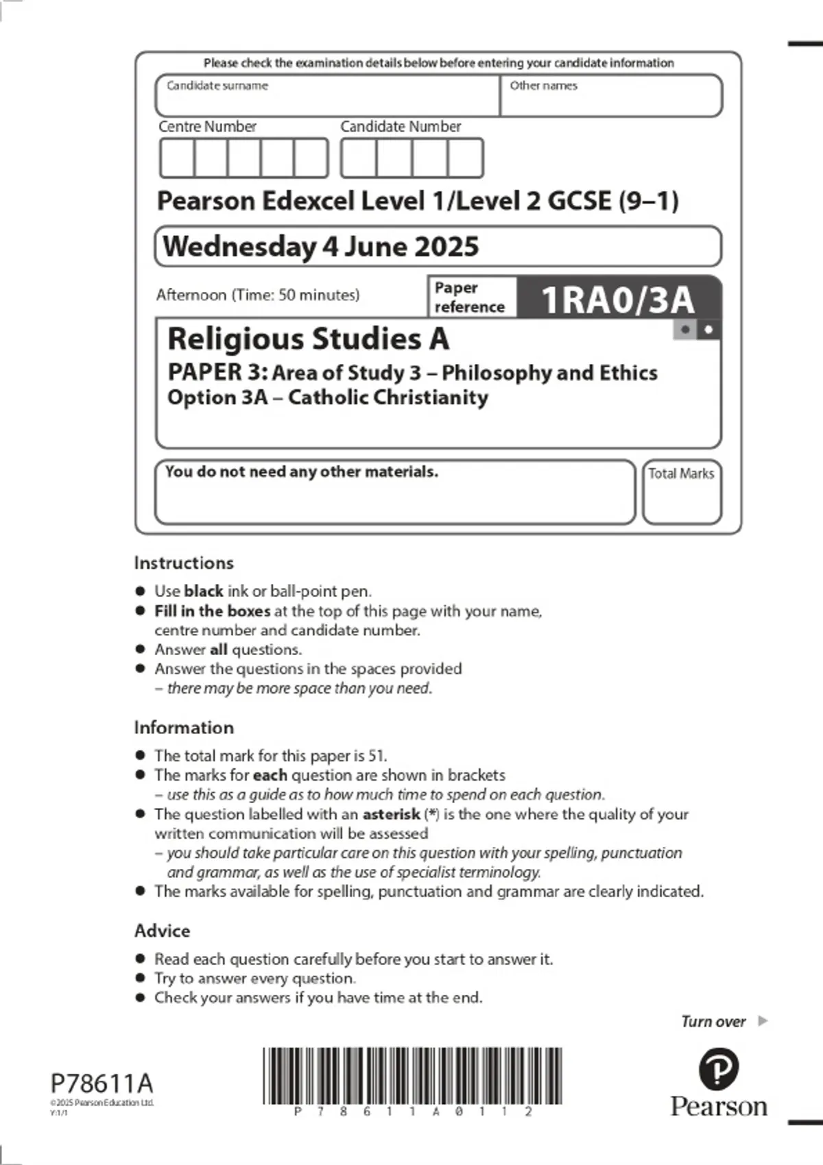 2025 Pearson Edexcel Level 1/Level 2 GCSE (9–1) Religious Studies A PAPER 3: Area of Study 3 – Philosophy and Ethics Option 3A – Catholic Christianity Combined Question Paper and Marking Scheme