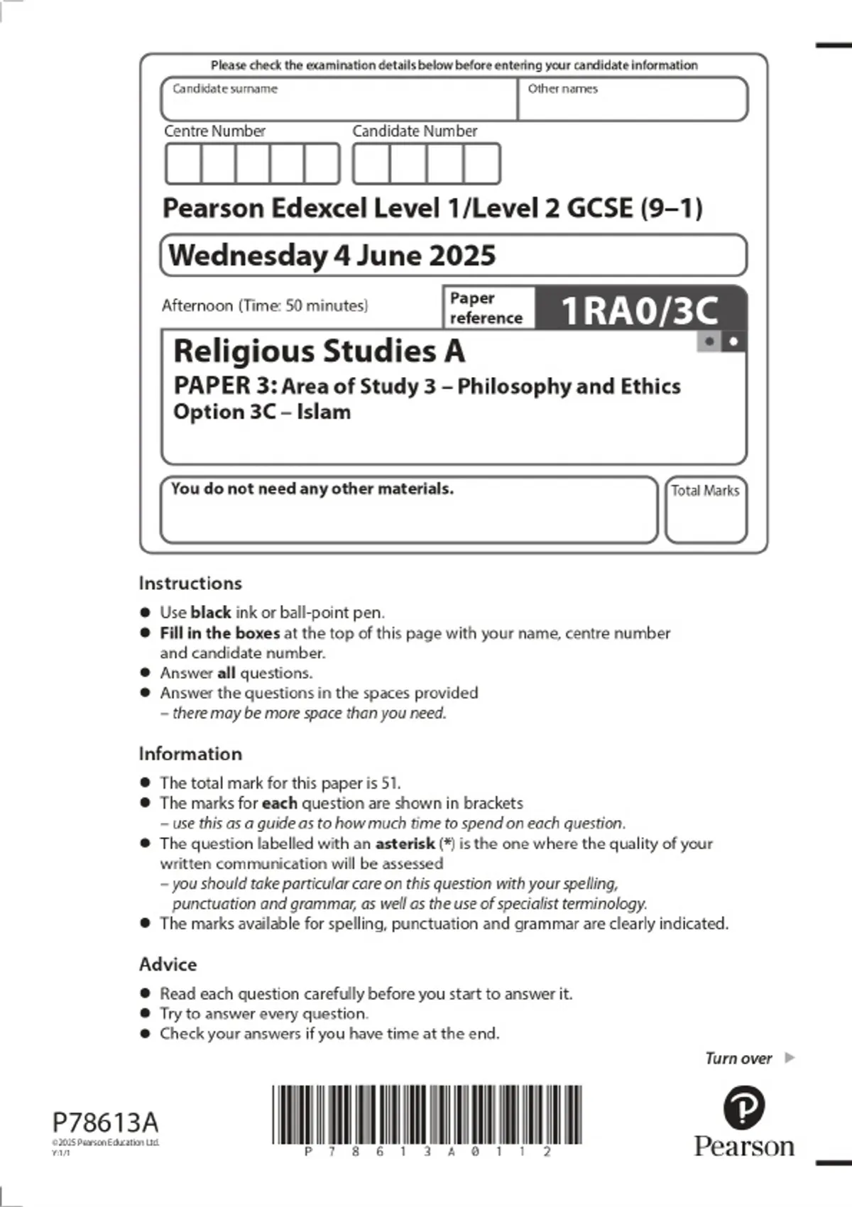 2025 Pearson Edexcel Level 1/Level 2 GCSE (9–1) Religious Studies A PAPER 3: Area of Study 3 – Philosophy and Ethics Option 3C – Islam Combined Question Paper and Marking Scheme