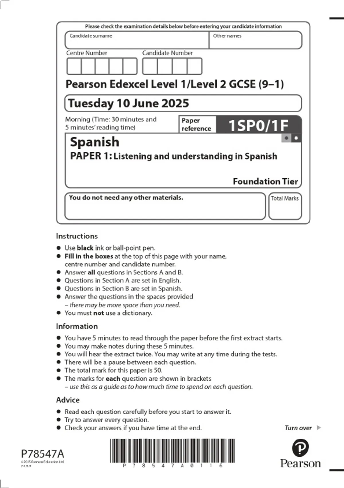 2025 Pearson Edexcel Level 1/Level 2 GCSE (9–1) Spanish PAPER 1: Listening and understanding in Spanish Foundation Tier Combined Question Paper and Marking Scheme