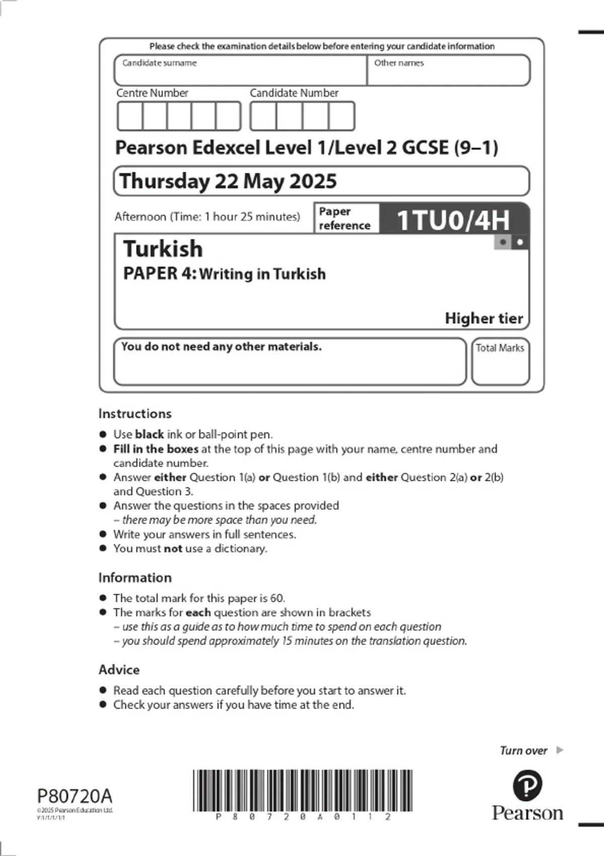 2025 Pearson Edexcel Level 1/Level 2 GCSE (9–1) Turkish PAPER 4: Writing in Turkish Higher Tier Combined Question Paper and Marking Scheme