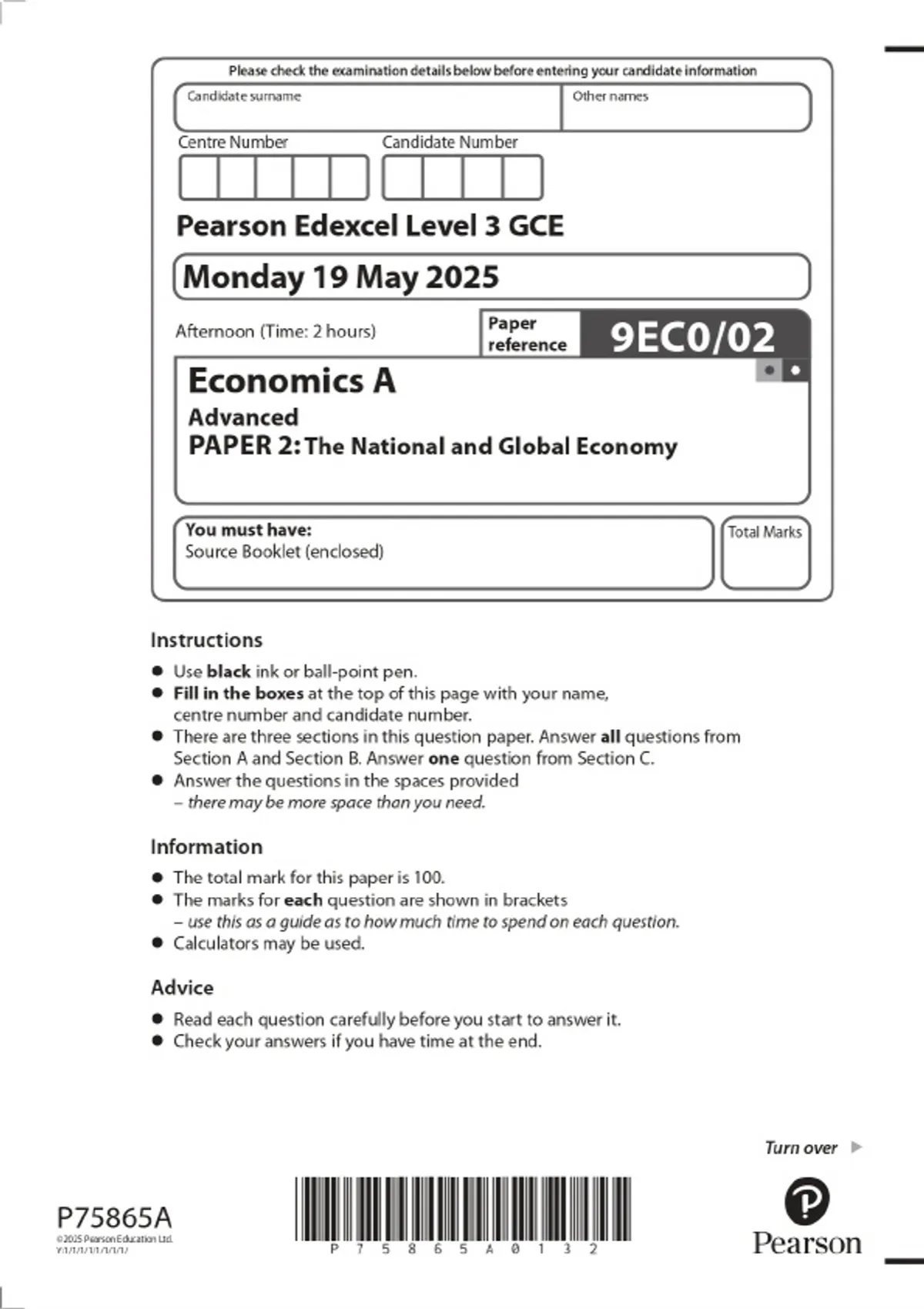 2025 Pearson Edexcel Level 3 GCE Economics A Advanced Subsidiary PAPER 2: The National and Global Economy Combined Question Paper and Marking Scheme