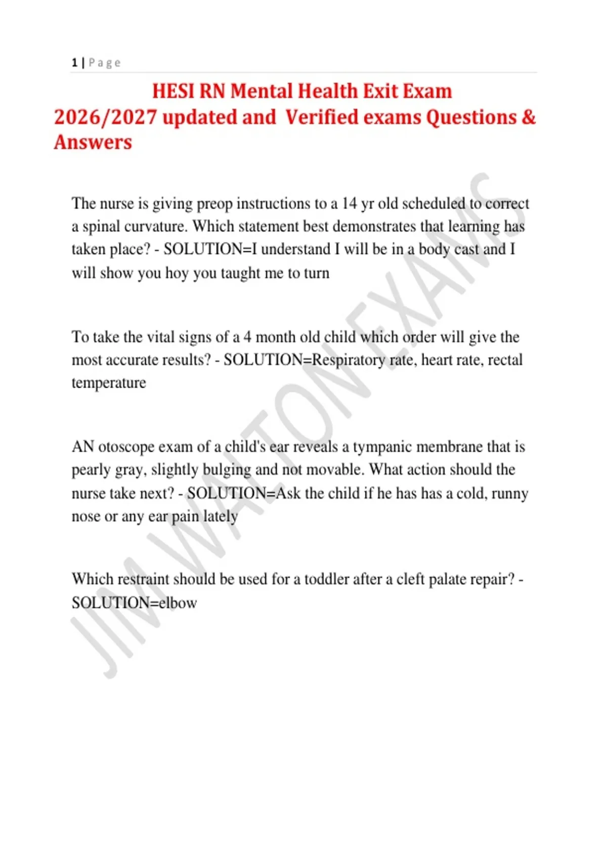 HESI RN Mental Health Exit Exam 2026/2027 updated and Verified exams Questions & Answers The nurse is giving preop instructions to a 14 yr old scheduled to correct a spinal curvature. Which statement best demonstrates that learning has taken place? - SOLUTION=I understand I will be in a body cast and I will show you hoy you taught me to turn To take the vital signs of a 4 month old child which order will give the most accurate results? - SOLUTION=Respiratory rate, heart rate, rectal temperature AN otoscope exam of a child's ear reveals a tympanic membrane that is pearly gray, slightly bulging and not movable. What action should the nurse take next? - SOLUTION=Ask the child if he has has a cold, runny nose or any ear pain lately Which restraint should be used for a toddler after a cleft palate repair? - SOLUTION=elbow 2 | P a g e A six month old returns from surgery with elbow restraints in place. What nursing intervention should be included when caring for any restrained child? - SOLUTION=remove restraints one at a time and provide range of motion exercise A two year old with Down Syndrome is brought to the clinic for his regular physical exam. The nurse knows which problem is frequently associated with Down Syndrome? - SOLUTION=Congenital Heart Disease When assessing a child with asthma the nurse should expect intercostal retractions during - SOLUTION=inspiration When planning the care for a child who has had a cleft lip repair, the nurse knows that crying should be minimized because it - SOLUTION=stresses the suture line A client with a productive cough has obtained a sputum specimen for culture as instructed. What action is the best initial nursing action? - SOLUTION=Administer the first dose of prescribed antibiotic therapy A client is brought to the Emergency Department by ambulance in cardiac arrest with CPR in progress. The client is intubated and receiving 100% O2 per ambu bag. The nurse determines the client is