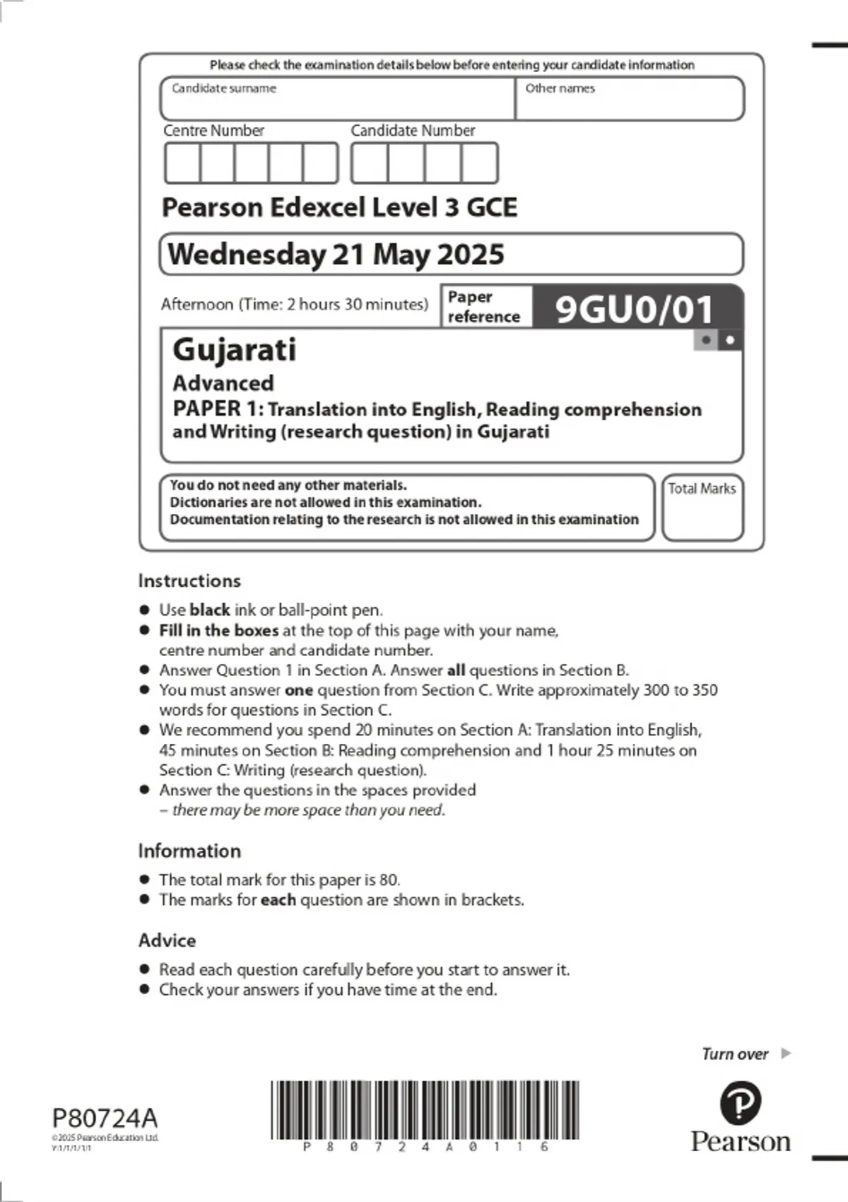 2025 Pearson Edexcel Level 3 GCE Gujarati Advanced PAPER 1: Translation into English, Reading comprehension and Writing (research question) in Gujarati Combined Question Paper and Marking Scheme