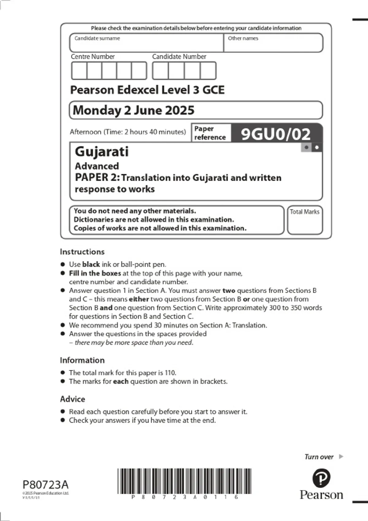 2025 Pearson Edexcel Level 3 GCE Gujarati Advanced PAPER 2: : Translation into Gujarati and written response to works Question Paper and Marking Scheme