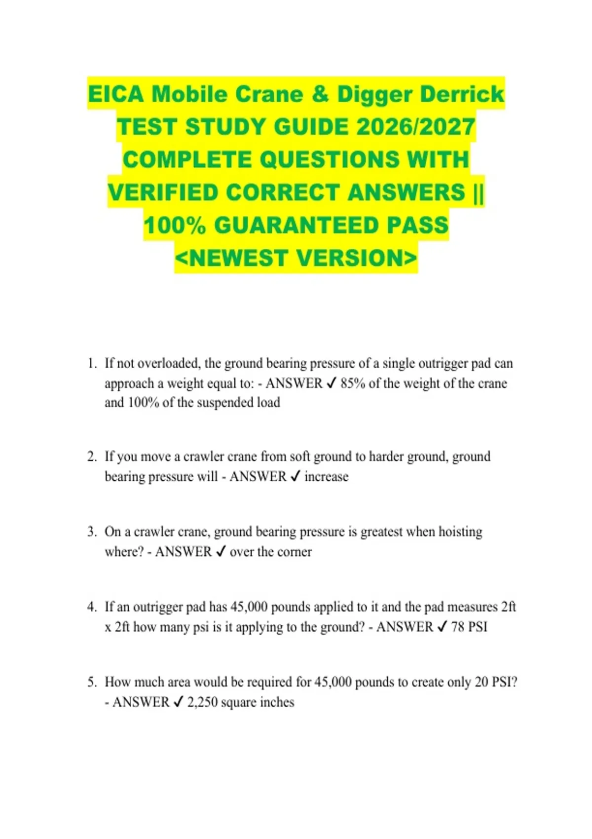 EICA Mobile Crane & Digger Derrick TEST STUDY GUIDE 2026/2027 COMPLETE QUESTIONS WITH VERIFIED CORRECT ANSWERS || 100% GUARANTEED PASS NEWEST VERSION 1. If not overloaded, the ground bearing pressure of a single outrigger pad can approach a weight equal to: - ANSWER 85% of the weight of the crane and 100% of the suspended load 2. If you move a crawler crane from soft ground to harder ground, ground bearing pressure will - ANSWER increase 3. On a crawler crane, ground bearing pressure is greatest when hoisting where? - ANSWER over the corner 4. If an outrigger pad has 45,000 pounds applied to it and the pad measures 2ft x 2ft how many psi is it applying to the ground? - ANSWER 78 PSI 5. How much area would be required for 45,000 pounds to create only 20 PSI? - ANSWER 2,250 square inches 6. Why use mats or cribbing? - ANSWER To reduce ground bearing pressure 7. What is the purpose of placing blocking or pads under the outrigger floats? - ANSWER Distribute the force over a larger area 8. While swinging a heavy load with a crane set up on outriggers and the operator swings over one of the outriggers, that outrigger must be able to support - ANSWER 85% of the weight of the crane and 100% of the weight of the load 9. Only approved attachments or extra counterweights made by the manufacturer should be placed on the rear of the crane because - ANSWER They could cause a backward stability problem 10. When working on rubber, cranes are rated at what percentage of tipping? - ANSWER 75% 11. Load chart ratings apply only when - ANSWER the crane is set up and maintained level, the hoist line is vertical at all times and the load is freely suspended during the lift, and the load is picked up directly under the boom tip 12. Boom trucks normally do not have capacities in which operating area? - ANSWER over the front 13. If the jib is removed from the Terex Stinger 3470 BT, what is the deduction? - ANSWER There is no deduction 14. A truck crane, with outriggers properly set, is rated at what percentage of its tipping capacity? - ANSWER 85% 15. When using load/capacity charts, what does the term "jib angle to ground" refer to? - ANSWER Main boom angle minus the jib's offset 16. If a jib is erected but not being used, it is treated as a deduction from the crane's - ANSWER Gross capacity 17. When setting up a crane, the outriggers on one side could not be extended and set in this position, which load chart must be used? - ANSWER On rubber 18. What must be done when the capacity listings are no longer legible on a load chart? - ANSWER Obtain new charts from the manufacturer 19. If while operating a crane and you fall between the radius listed on the load chart, you must use the - ANSWER Next greater radius listed 20. What should be compared to determine if the load charts are correct for the crane you are operating? - ANSWER Serial numbers 21. What information will a range diagram not give the operator? - ANSWER Capacities 22. The line pull on your crane is 6,000 lbs and the load you want to lift weighs 25,000 lbs. What is the minimum number of parts of line needed to lift the load? - ANSWER 5 23. According to OSHA what designation of person must perform a visual pre shift inspection? - ANSWER Competent 24. According to OSHA 1926 Subpart CC, who shall perform a shift inspection on a crane? - ANSWER Competent Person 25. Wire rope on mobile cranes shall have a thorough documented inspection at what minimum interval? - ANSWER Monthly 26. A frequent inspection is - ANSWER Daily to monthly 27. A periodic inspection is - ANSWER Monthly to annually 28. Cranes idle for more than 6 months must have which inspection(s) performed. - ANSWER Frequent and periodic 29. Cranes idle for less than 6 months must have what type of inspection performed. - ANSWER Frequent 30. A crane hooks throat opening must not exceed - ANSWER 5% of its original size 31. How many broken wires must be present in one strand of one lay for running wire rope to be removed from service? - ANSWER 3