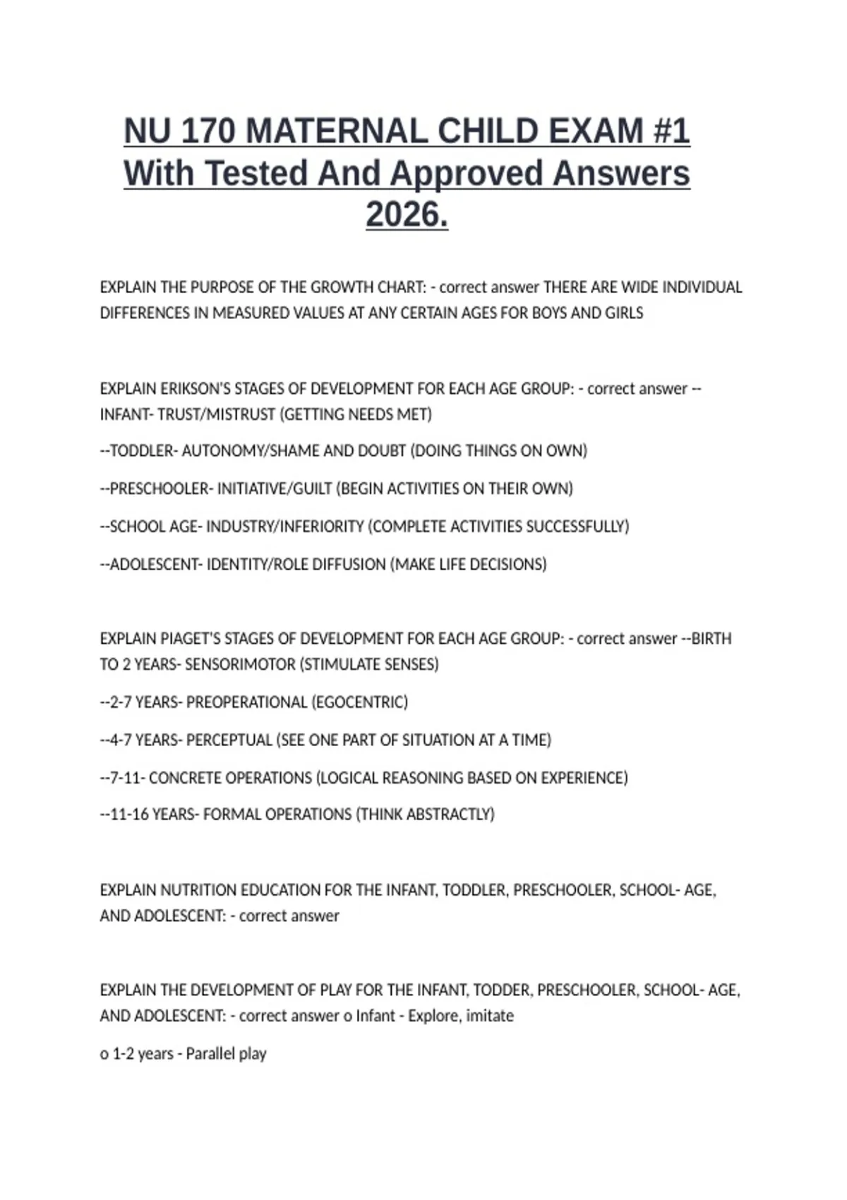 NU 170 MATERNAL CHILD EXAM #1 With Tested And Approved Answers 2026.
