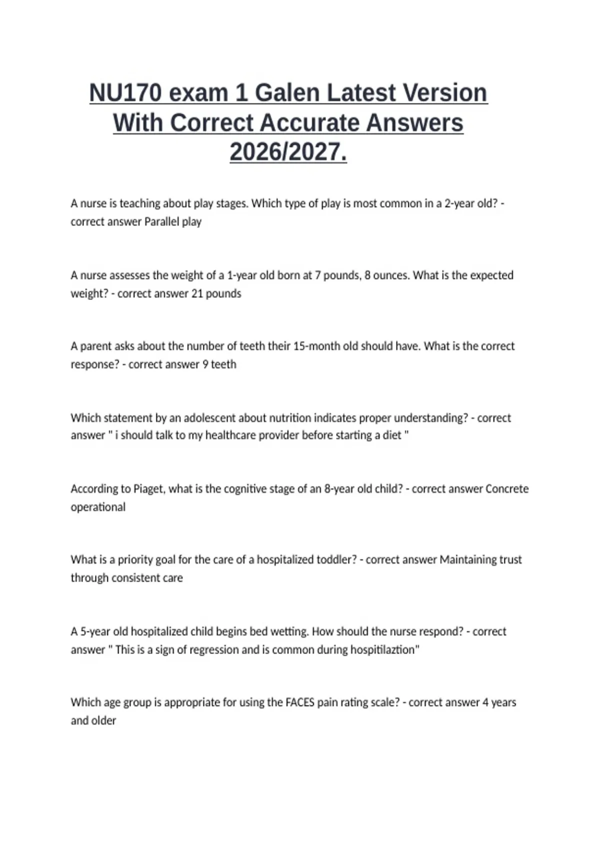 A nurse is teaching about play stages. Which type of play is most common in a 2-year old? - correct answer Parallel play A nurse assesses the weight of a 1-year old born at 7 pounds, 8 ounces. What is the expected weight? - correct answer 21 pounds A parent asks about the number of teeth their 15-month old should have. What is the correct response? - correct answer 9 teeth Which statement by an adolescent about nutrition indicates proper understanding? - correct answer " i should talk to my healthcare provider before starting a diet " According to Piaget, what is the cognitive stage of an 8-year old child? - correct answer Concrete operational What is a priority goal for the care of a hospitalized toddler? - correct answer Maintaining trust through consistent care A 5-year old hospitalized child begins bed wetting. How should the nurse respond? - correct answer " This is a sign of regression and is common during hospitilaztion" Which age group is appropriate for using the FACES pain rating scale? - correct answer 4 years and older