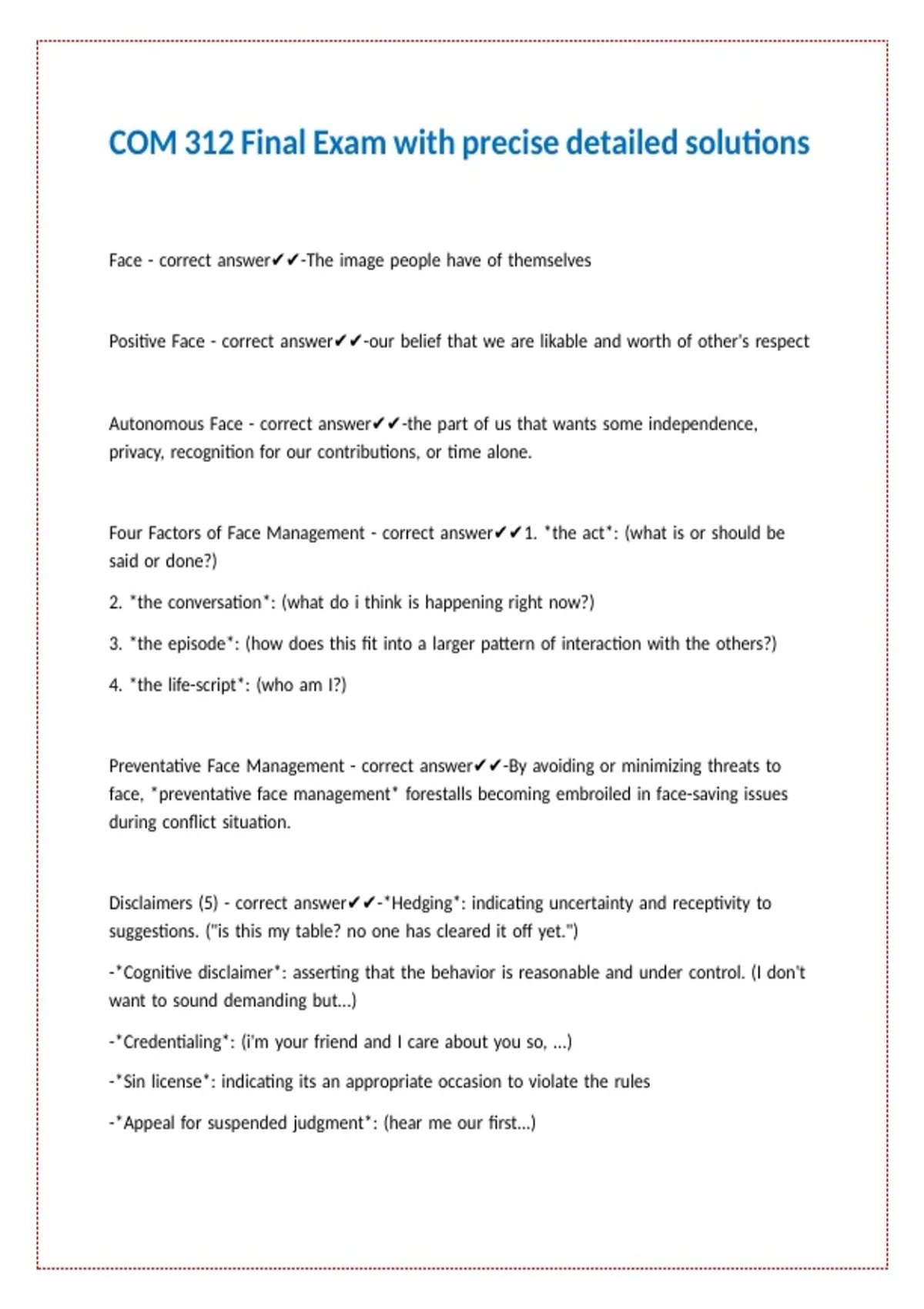 Corrective Face Management - correct answer✔✔-statements meant to ameliorate the effect ||\\//|| ||\\//|| ||\\//|| ||\\//|| ||\\//|| ||\\//|| ||\\//|| ||\\//|| ||\\//|| ||\\//||