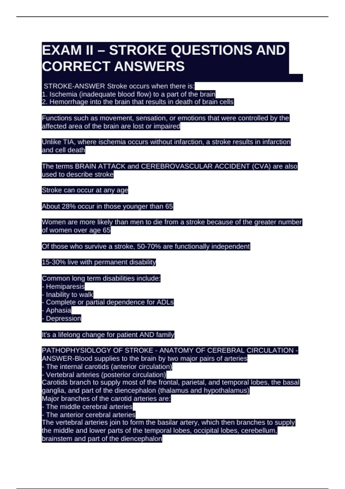 EXAM II – STROKE QUESTIONS AND CORRECT ANSWERS