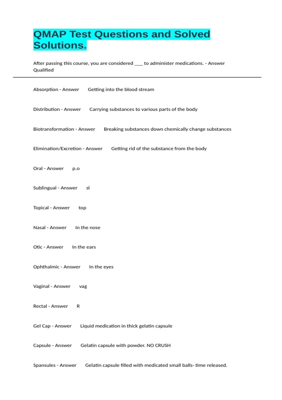 After passing this course, you are considered ___ to administer medications. - Answer Qualified Absorption - Answer Getting into the blood stream Distribution - Answer Carrying substances to various parts of the body Biotransformation - Answer Breaking substances down chemically change substances Elimination/Excretion - Answer Getting rid of the substance from the body Oral - Answer p.o Sublingual - Answer sl Topical - Answer top Nasal - Answer In the nose Otic - Answer In the ears Ophthalmic - Answer In the eyes Vaginal - Answer vag Rectal - Answer R Gel Cap - Answer Liquid medication in thick gelatin capsule Capsule - Answer Gelatin capsule with powder. NO CRUSH Spansules - Answer Gelatin capsule filled with medicated small balls- time released.