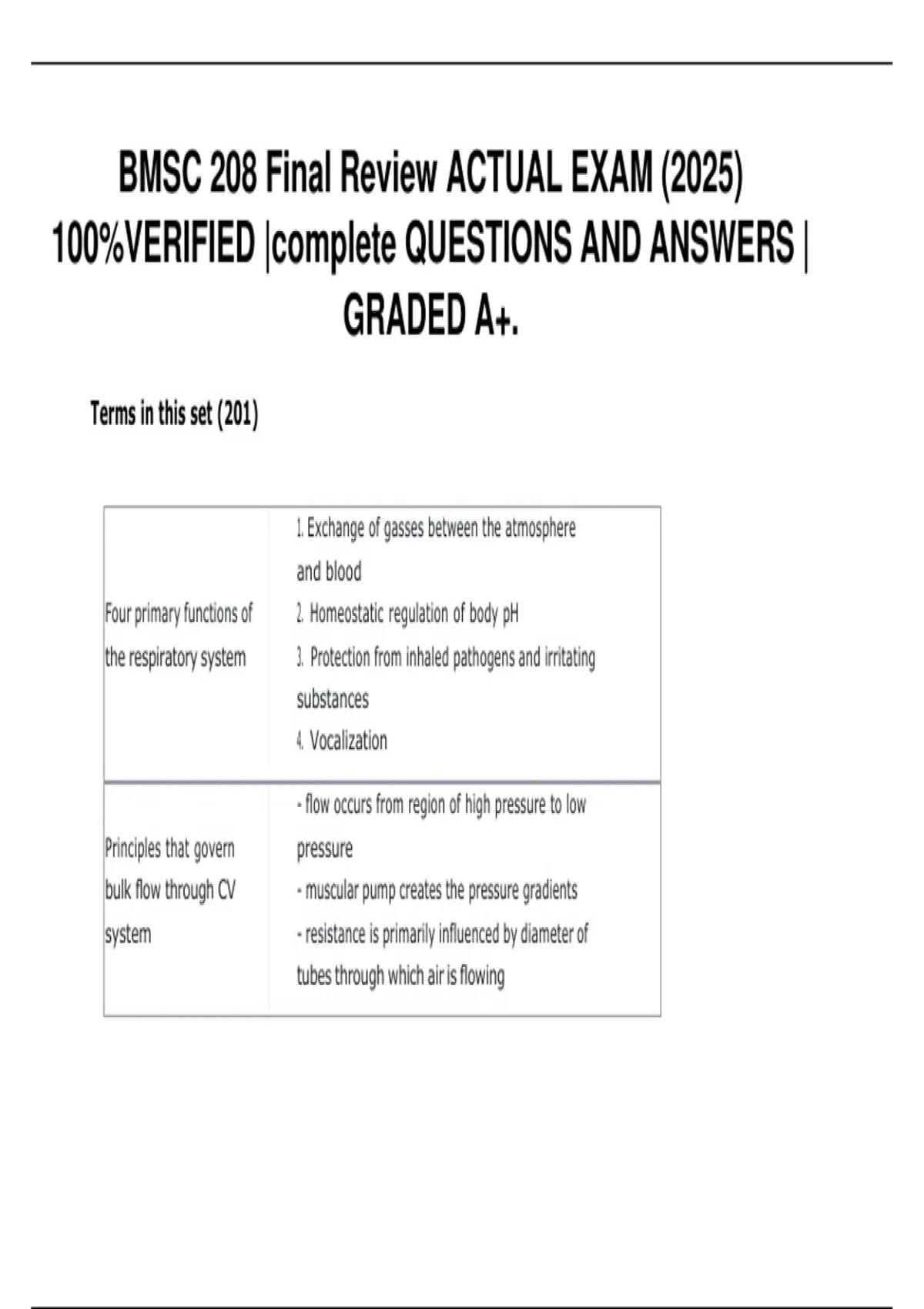 This document contains the complete and verified questions and answers from the BMSC 208 Final Exam (2025). It provides detailed explanations covering all major topics assessed in the course, making it a reliable resource for final review and exam preparation. The material is designed to help students confidently revise and achieve top grades.