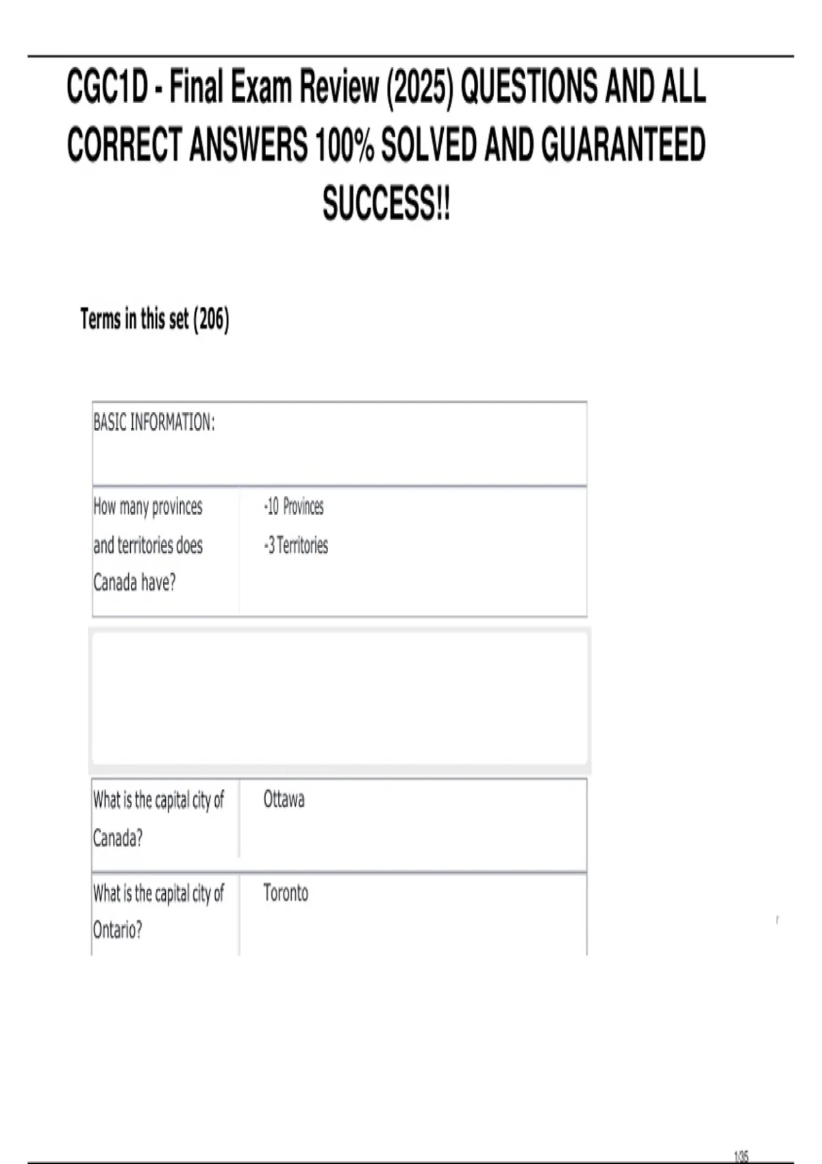 This document contains a complete set of review questions and verified correct answers for the CGC1D Final Exam. It covers all major course concepts, including geography, global issues, and critical thinking topics, with clear explanations to support effective revision and confident exam performance. The material is designed for thorough preparation and maximizing success on the final exam.