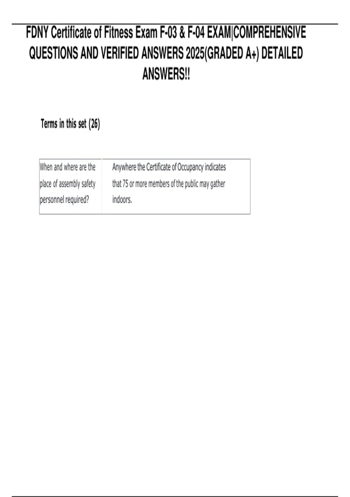 This document contains a complete set of comprehensive questions with verified answers for the FDNY Certificate of Fitness Exams F-03 and F-04 (2025). It covers all key safety procedures, fire protection systems, code compliance, and operational guidelines required for certification, with detailed explanations to ensure full understanding and effective exam preparation. The material is ideal for practice, review, and achieving top scores.