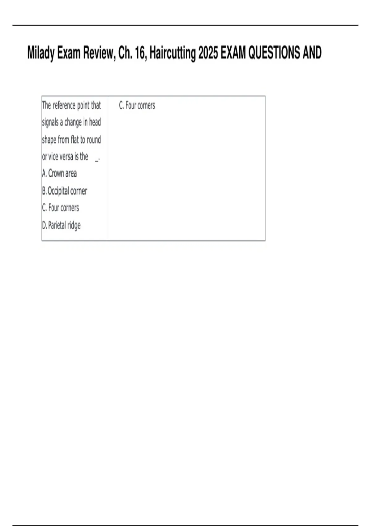 This document contains a complete set of exam questions with verified answers for Chapter 16: Haircutting from the Milady Exam Review (2025). It covers all key concepts, techniques, tools, and safety procedures related to haircutting, with detailed explanations to support understanding, practical application, and exam preparation. The material is ideal for review, practice, and achieving top performance in cosmetology exams.
