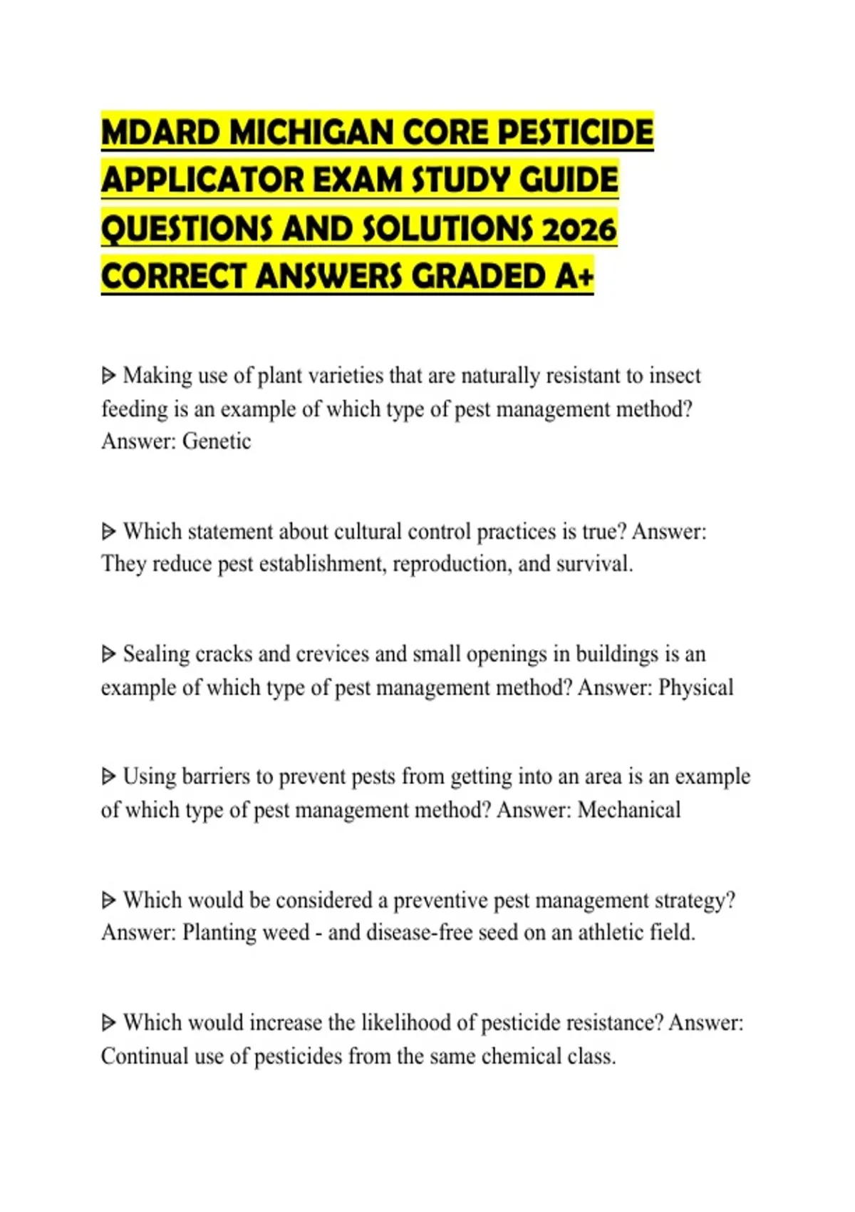 MDARD MICHIGAN CORE PESTICIDE APPLICATOR EXAM STUDY GUIDE QUESTIONS AND SOLUTIONS 2026 CORRECT ANSWERS GRADED A+