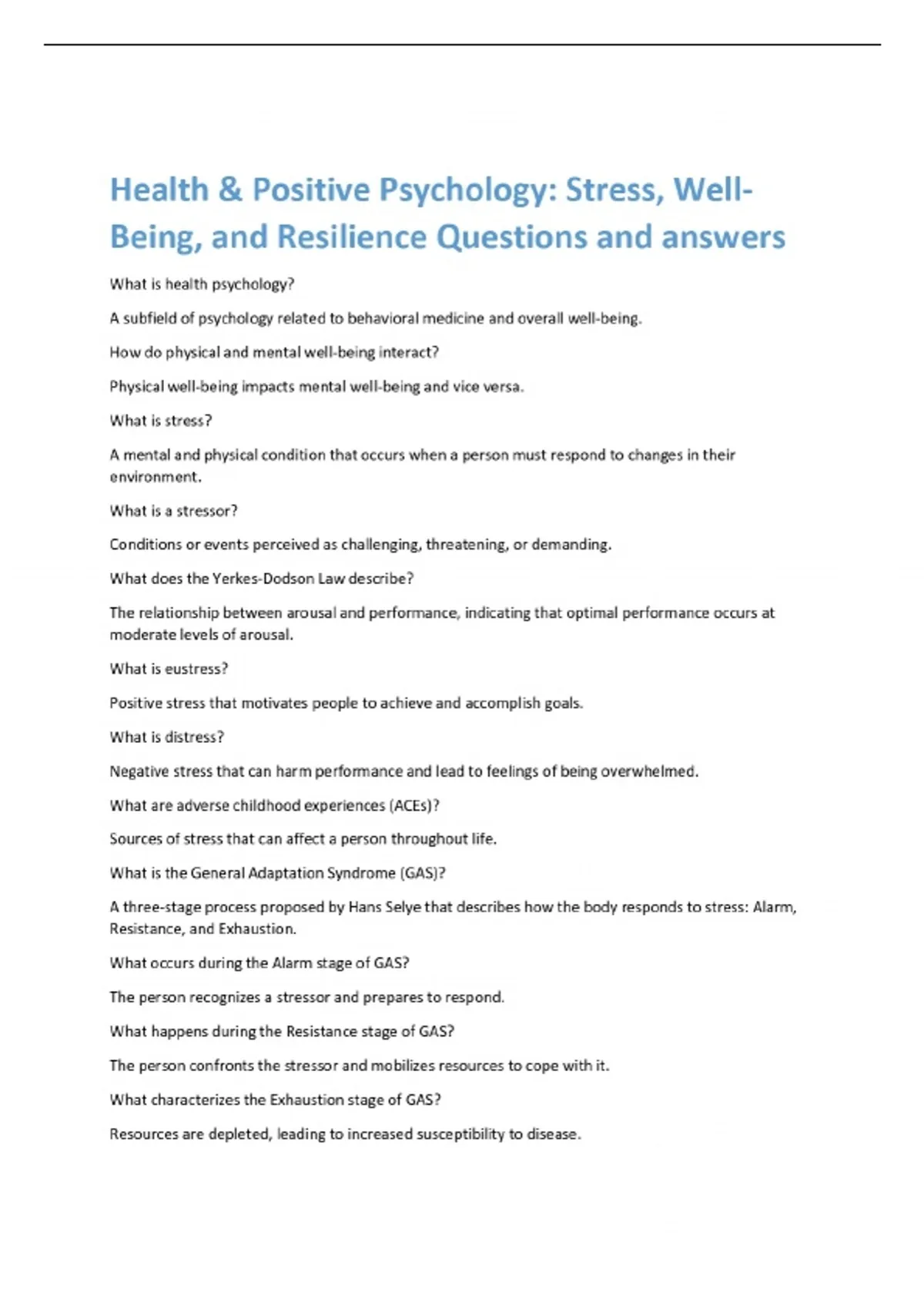 Health & Positive Psychology: Stress, Well Being, and Resilience Questions and answers What is health psychology? A subfield of psychology related to behavioral medicine and overall well-being. How do physical and mental well-being interact? Physical well-being impacts mental well-being and vice versa. What is stress? A mental and physical condition that occurs when a person must respond to changes in their environment. What is a stressor? Conditions or events perceived as challenging, threatening, or demanding. What does the Yerkes-Dodson Law describe? The relationship between arousal and performance, indicating that optimal performance occurs at moderate levels of arousal. What is eustress? Positive stress that motivates people to achieve and accompli