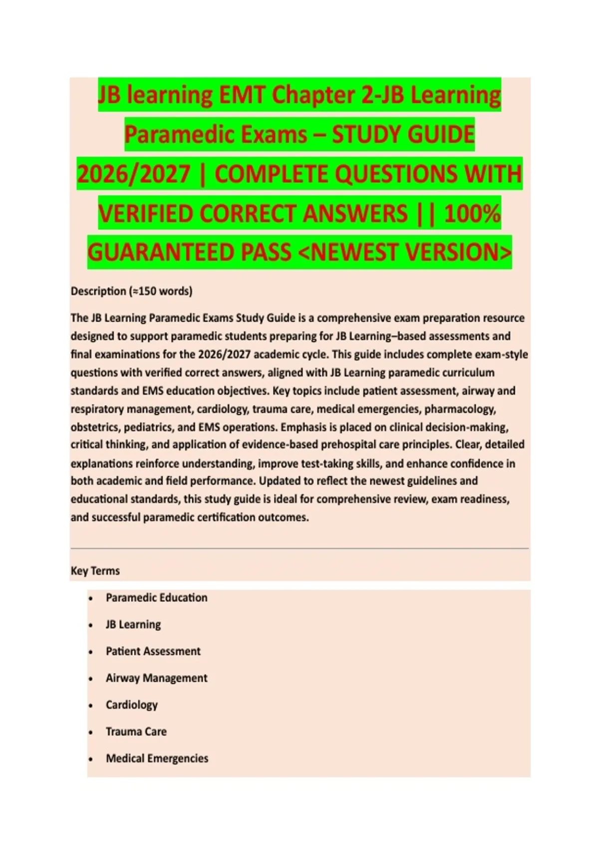 questions with verified correct answers, aligned with JB Learning paramedic curriculum