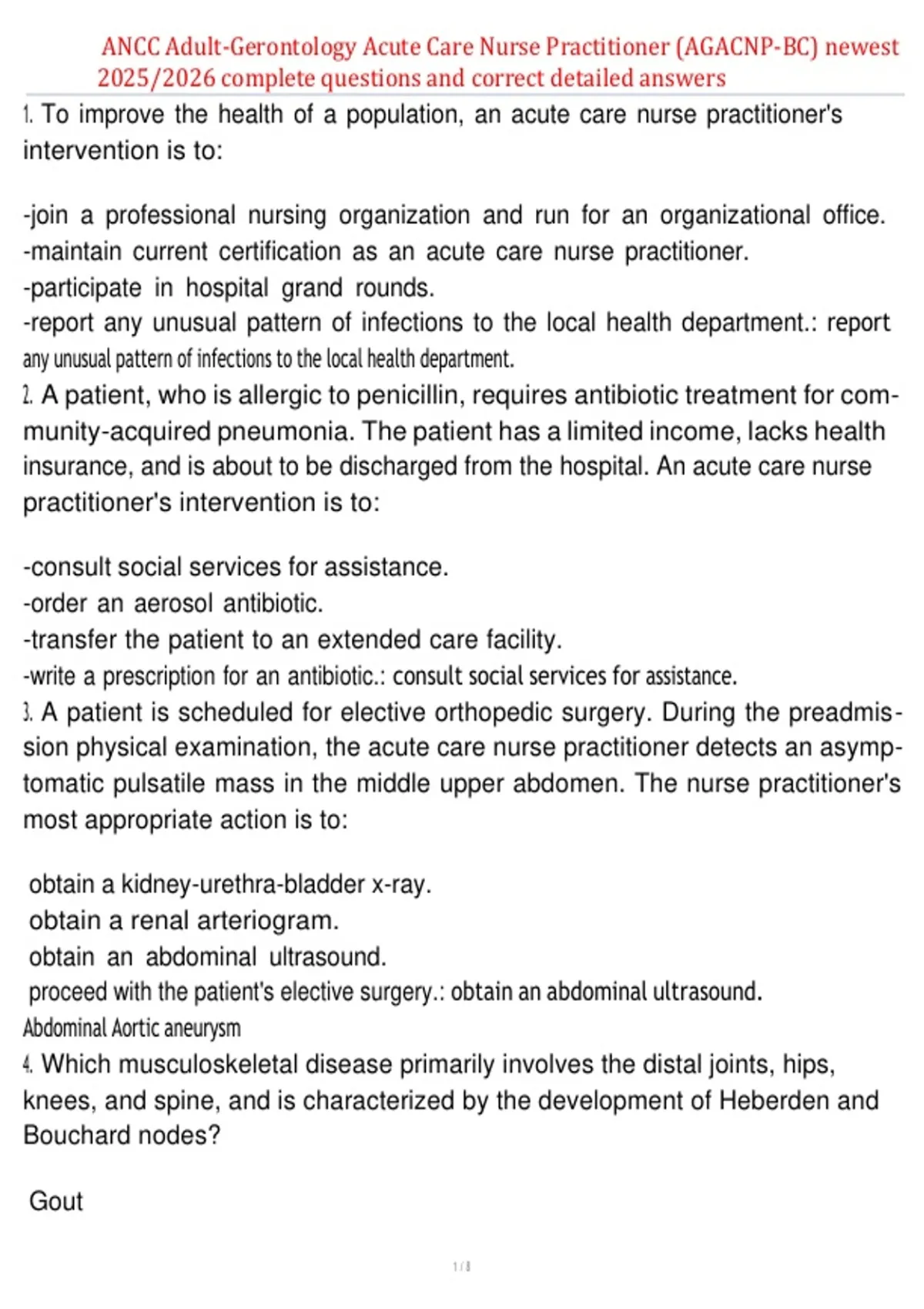 1. To improve the health of a population, an acute care nurse practitioner's intervention is to: -join a professional nursing organization and run for an organizational office. -maintain current certification as an acute care nurse practitioner. -participate in hospital grand rounds. -report any unusual pattern of infections to the local health department.: report any unusual pattern of infections to the local health department. 2. A patient, who is allergic to penicillin, requires antibiotic treatment for com- munity-acquired pneumonia. The patient has a limited income, lacks health insurance, and is about to be discharged from the hospital. An acute care nurse practitioner's intervention is to: -consult social services for assistance. -order an aerosol antibiotic. -transfer the patient to an extended care facility. -write a prescription for an antibiotic.: consult social services for assistance. 3. A patient is scheduled for elective orthopedic surgery. During the preadmis- sion physical examination, the acute care nurse practitioner detects an asymp- tomatic pulsatile mass in the middle upper abdomen. The nurse practitioner's most appropriate action is to: obtain a kidney-urethra-bladder x-ray. obtain a renal arteriogram. obtain an abdominal ultrasound. proceed with the patient's elective surgery.: obtain an abdominal ultrasound. Abdominal Aortic aneurysm 4. Which musculoskeletal disease primarily involves the distal joints, hips, knees, and spine, and is characterized by the development of Heberden and Bouchard nodes? Gout 1 / 8 ANCC Adult-Gerontology Acute Care Nurse Practitioner (AGACNP-BC) newest 2025/2026 complete questions and correct detailed answers Osteoarthritis Osteoporosis Rheumatoid arthritis: Osteoarthritis Heberden: distal phalanges Bouchard: proximal phalanges Ditterence between OA and RA: Heberden and Bouchard nodes are often seen in digits, they are bony round growth near the joints, while rheumatoid nodules are more common with arms and elbows underneath the skin, people with RA later develop curving and bending of fingers. 5. An acute care nurse practitioner is deciding whether to recommend a long-term medication regimen that will help a patient manage disease symp- toms but may also introduce problematic side effects. This decision reflects which ethical principle? Autonomy Beneficence Fidelity Justice: beneficence 6. A patient, who has been in the intensive care unit for 17 days, develops hy- pernatremic hyperosmolality. The patient weighs 132 lb (59.9 kg), is intubated, and is receiving mechanical ventilation. The serum osmolality is 320 mOsm/L kg H2O. Clinical signs include tachycardia and hypotension. An acute care nurse practitioner's initial treatment is to: reduce serum osmolality by infusing a 5% dextrose in 0.2% sodium chloride solution. reduce serum sodium concentration by infusing a 0.45% sodium c: replenish volume by infusing a 0.9% sodium chloride solution. priority is to replenish the volume and the fix the osmolality 7. A 78-year-old male patient with heart failure develops a bacterial urinary tract infection secondary to an indwelling Foley catheter. The patient has a known history of allergy to penicillin and sulfonamides. The appropriate choice for 2 / 8 ANCC Adult-Gerontology Acute Care Nurse Practitioner (AGACNP-BC) newest 2025/2026 complete questions and correct detailed answers antimicrobial therapy is: cephalexin (Keflex). ciprofloxacin (Cipro). doxycycline (Vibramycin). tetracycline (Sumycin).: ciprofloxacin (Cipro) Cephalosporin (ceph) are "cousins" with penicillin (cross-allergy). Tetracyclines can cause severe side ettects and are not recommended for elderly. 8. An acute care nurse practitioner is evaluating a 78-year-old patient for an aortic valve replacement. Laboratory results indicate a low serum albumin level. The nurse practitioner prescribes a high-protein diet and evaluates the patient's response by: assessing the total serum protein level. calculating the body fat percentage. obtaining a complete blood count. obtaining a serum prealbumin level.: obtaining a serum prealbumin level. Albumin is relatively insensitive to change of nutritional status. Our body has a large pool of albumin and it could take up to 14 days for albumin to come back to normal once the pool is depleted. Albumin level could also be attected by one's renal function and hydration state. Prealbumin is one of the earliest indicator for nutritional status now. Normal level 16-35 mg/dL 9. A 42-year-old patient with metastatic lung cancer is admitted with severe intractable pain related to a pathologic fracture of the left femur. The plan is to stabilize the fracture surgically, and begin local radiation therapy to the site. For this patient, the most appropriate analgesic regimen is: -fentanyl (Duragesic) transdermal system applied every 72 hours. -meperidine (Demerol) 50 mg intramuscularly every three hours around the clock. -morphine sulfate (Avinza) IV via a patient-contro: morphine sulfate (Avinza) IV via a pa- tient-controlled analgesia pump with a basal rate. 3 / 8 ANCC Adult-Gerontology Acute Care Nurse Practitioner (AGACNP-BC) newest 2025/2026 complete questions and correct detailed answers 10. A female patient is receiving adjuvant chemotherapy for breast cancer and has been given information about her treatment regimen, expected side ef- fects, and symptom management. Which symptom, if occurring two weeks after treatment, warrants a prompt call to the acute care nurse practitioner? Alopecia Fatigue Fever Nausea: fever - infection 11. A patient with hydrocephalus secondary to a subarachnoid hemorrhage has developed an intracranial pressure of 25 mm Hg. The acute care nurse practitioner's intervention is to: -hyperventilate to reach a PCO2 of 30 mm Hg. -order dexamethasone (Decadron) 4 mg IV. -perform a ventriculostomy and drainage of cerebrospinal fluid. -prescribe mannitol (Osmitrol) 100 g IV.: perform a ventriculostomy and drainage of cerebrospinal flu