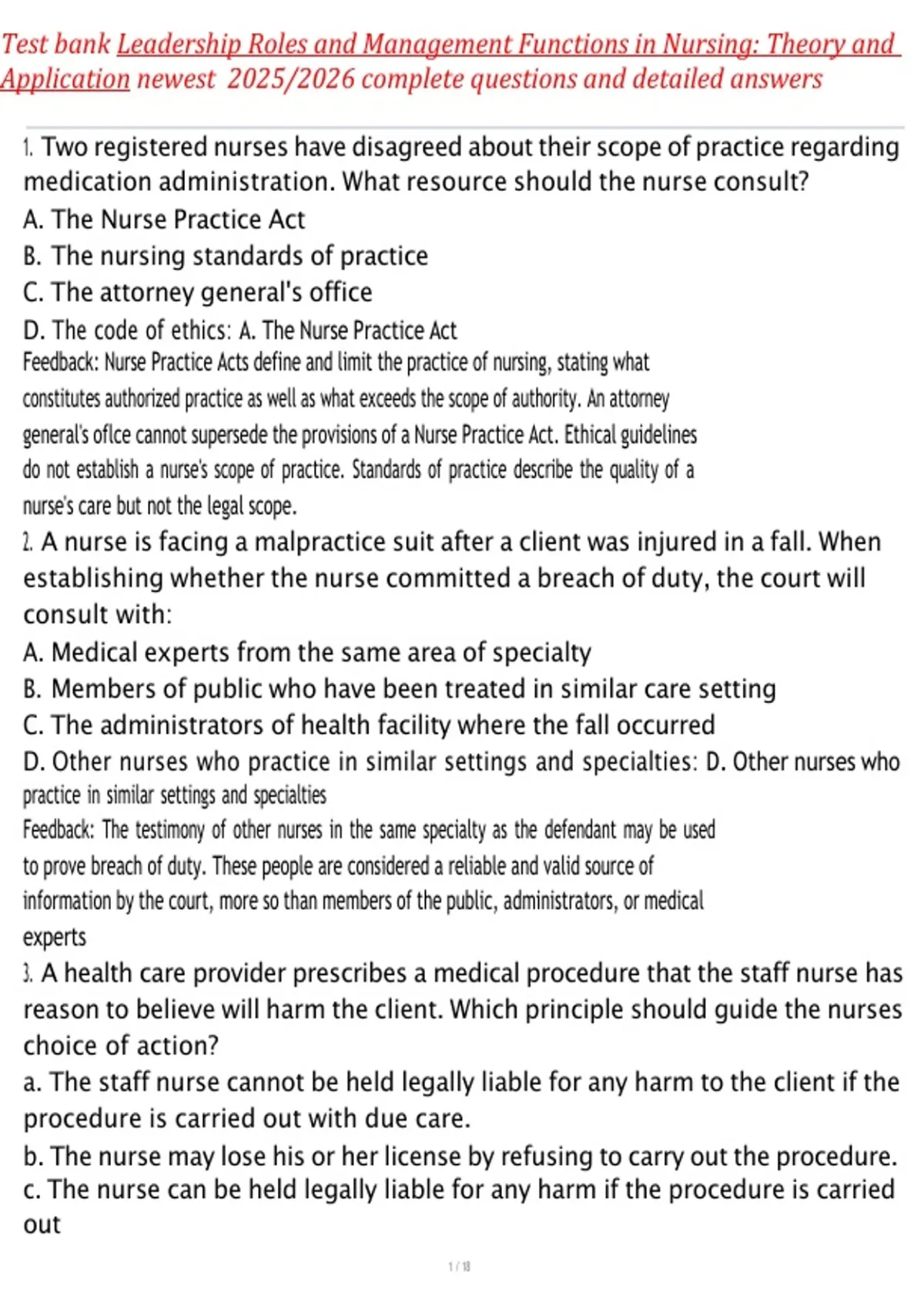 1. Two registered nurses have disagreed about their scope of practice regarding medication administration. What resource should the nurse consult? A. The Nurse Practice Act B. The nursing standards of practice C. The attorney general's office D. The code of ethics: A. The Nurse Practice Act Feedback: Nurse Practice Acts define and limit the practice of nursing, stating what constitutes authorized practice as well as what exceeds the scope of authority. An attorney general's oflce cannot supersede the provisions of a Nurse Practice Act. Ethical guidelines do not establish a nurse's scope of practice. Standards of practice describe the quality of a nurse's care but not the legal scope. 2. A nurse is facing a malpractice suit after a client was injured in a fall. When establishing whether the nurse committed a breach of duty, the court will consult with: A. Medical experts from the same area of specialty B. Members of public who have been treated in similar care setting C. The administrators of health facility where the fall occurred D. Other nurses who practice in similar settings and specialties: D. Other nurses who practice in similar settings and specialties Feedback: The testimony of other nurses in the same specialty as the defendant may be used to prove breach of duty. These people are considered a reliable and valid source of information by the court, more so than members of the public, administrators, or medical experts 3. A health care provider prescribes a medical procedure that the staff nurse has reason to believe will harm the client. Which principle should guide the nurses choice of action? a. The staff nurse cannot be held legally liable for any harm to the client if the procedure is carried out with due care. b. The nurse may lose his or her license by refusing to carry out the procedure. c. The nurse can be held legally liable for any harm if the procedure is carried out 1 / 18 Test bank Leadership Roles and Management Functions in Nursing: Theory and Application newest 2025/2026 complete questions and detailed answers without questioning it. d. Liability rests with the health-care provider, not the nurse.: ANS: C Feedback: The rule of personal liability says that every person is liable for his or her own conduct, even if someone else prescribed the intervention. The law does not permit a wrongdoer to avoid legal liability for his or her own wrongdoing, even though someone else also may be sued and held legally liable. "Due care" does not negate the consequences of the nurse's actions or release the nurse from liability if he or she knowingly committed an unsafe act. Refusal to carry out the procedure would not be a basis for losing a nursing license. 4. The preoperative admitting nurse witnessed a client sign an operative con- sent form. The nurse then cosigned the same document as a witness. The client suffered an injury during surgery and names the nurse in the suit because the nurse witnessed the consent form. What is the most likely outcome? a. The nurse is not likely liable because the signature only specifies that the nurse witnessed the client signing the consent form. b. The nurse is likely not liable because surgery is beyond the nurse's scope of practice. c. The nurse may be liable because cosigning the consent form makes the nurse an equal member of the surgical team. d. The nurse is liable because cosigning the consent form confirms that the client fully understood the risks of surgery.: ANS: A Feedback: Informed consent is obtained by a physician; therefore, in most cases, a nurse is not legally responsible for informed consent but is confirming that the client signed the consent form. If the nurse acts solely in the role of a witness, there are not likely to be legal consequences for the nurse. The nurse would not be considered to be a full member of the 2 / 18 Test bank Leadership Roles and Management Functions in Nursing: Theory and Application newest 2025/2026 complete questions and detailed answers surgical team if his or her role was limited to admitting the client. Surgery is beyond the nurse's scope of practice, but this does not form the basis for the nurse's likely exemption from liability. 5. A client is preparing to be discharged from the health-care facility and has told the nurse that he would like to read his medical record. What is the nurse's best initial action? a. Arrange for the medical record to be provided to the client. b. Inform the client that this request will be communicated to the facility's ethics committee. c. Confirm the facility's policy around providing medical records to clients. d. Check whether this provision is included in the jurisdiction's Nurse Practice Act.: ANS: C Feedback: Clients possess a right to view their medical records, but the protocols for facilitating this vary. Consequently, the nurse should check this facility's policy before acting. It would likely be premature for the nurse to provide the medical record to the client before communicating with other members of the care team or administrators to ensure policy is followed. This matter is outside the purview of ethics committees because it does not involve a dilemma. The Nurse Practice Act focuses on scope of practice and other regulatory issues, not client rights 6. A charge nurse has discovered that a medication error was made on the previous shift. What is the nurse's best action? a. Share that information with the charge nurse on the previous shift. b. Document the incident and follow it up as per hospital policy. c. Write a memo to the nurse who made the error requesting an incident report be written. d. Document in the client's chart that an incident report will be completed.: ANS: B Feedback: It is the responsibility as manager to immediately document the error according 3 / 18 Test bank Leadership Roles and Management Functions in Nursing: Theory and Application newest 2025/2026 complete questions and detailed answers to hospital policy. Because pol