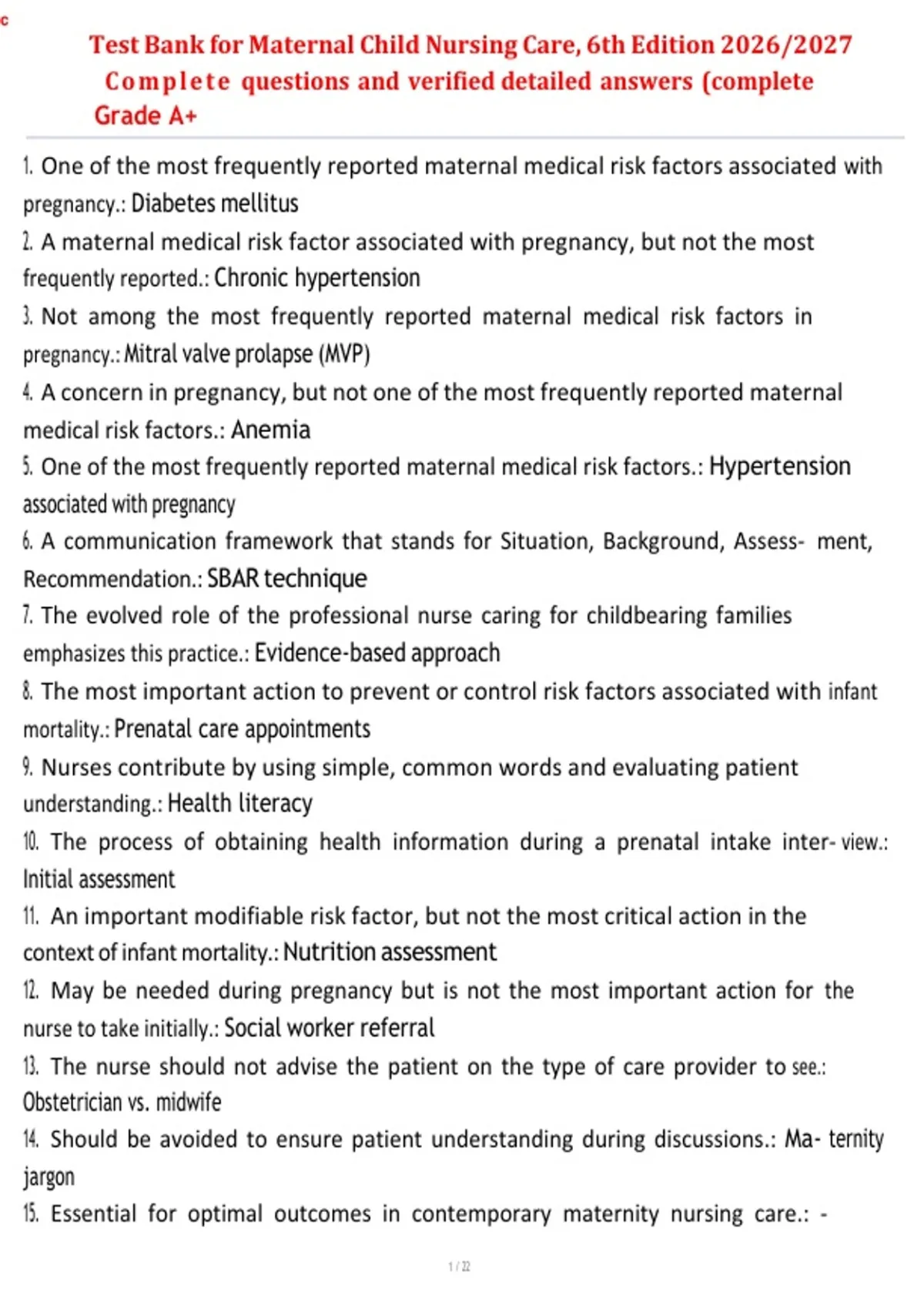1. One of the most frequently reported maternal medical risk factors associated with pregnancy.: Diabetes mellitus 2. A maternal medical risk factor associated with pregnancy, but not the most frequently reported.: Chronic hypertension 3. Not among the most frequently reported maternal medical risk factors in pregnancy.: Mitral valve prolapse (MVP) 4. A concern in pregnancy, but not one of the most frequently reported maternal medical risk factors.: Anemia 5. One of the most frequently reported maternal medical risk factors.: Hypertension associated with pregnancy 6. A communication framework that stands for Situation, Background, Assess- ment, Recommendation.: SBAR technique 7. The evolved role of the professional nurse caring for childbearing families emphasizes this practice.: Evidence-based approach 8. The most important action to prevent or control risk factors associated with infant mortality.: Prenatal care appointments 9. Nurses contribute by using simple, common words and evaluating patient understanding.: Health literacy 10. The process of obtaining health information during a prenatal intake inter- view.: Initial assessment 11. An important modifiable risk factor, but not the most critical action in the context of infant mortality.: Nutrition assessment 12. May be needed during pregnancy but is not the most important action for the nurse to take initially.: Social worker referral 13. The nurse should not advise the patient on the type of care provider to see.: Obstetrician vs. midwife 14. Should be avoided to ensure patient understanding during discussions.: Ma- ternity jargon 15. Essential for optimal outcomes in contemporary maternity nursing care.: - 1 / 22 c Test Bank for Maternal Child Nursing Care, 6th Edition 2026/2027 compupdate|com- Grade A+ Complete questions and verified detailed answers (complete solutions) GRADE A+ Communication with clinicians 2 / 22 c Test Bank for Maternal Child Nursing Care, 6th Edition 2026/2027 compupdate|com- Grade A+ Complete questions and verified detailed answers (complete solutions) GRADE A+ 16. A category in the nursing process that emphasizes the importance of patient assessment.: Client Needs: Physiologic Integrity 17. A category in the nursing process focused on providing safe care.: Client Needs: Safe and Ettective Care Environment 18. A category in the nursing process that includes promoting health and pre- venting illness.: Client Needs: Health Promotion and Maintenance 19. A level of cognitive understanding required for certain nursing assess- ments.: Cognitive Level: Knowledge 20. A level of cognitive understanding necessary for interpreting patient needs.- : Cognitive Level: Comprehension 21. Not explicitly mentioned, but implied in the context of using knowledge in practice.: Cognitive Level: Application 22. Not explicitly mentioned, but relevant for evaluating patient information.: - Cognitive Level: Analysis 23. Not explicitly mentioned, but important for developing patient care plans.: - Cognitive Level: Synthesis 24. Not explicitly mentioned, but essential for assessing patient outcomes.: Cog- nitive Level: Evaluation 25. Associated with both diabetes and hypertension during pregnancy.: Maternal obesity 26. The continuum of care provided by nurses throughout pregnancy and child- birth.: Childbearing cycle 27. The time frame during which nurses care for women in various settings.: Pre- natal period 28. Alternative care settings where nurses provide care for childbearing fami- lies.: Birthing centers 29. One of the settings where nurses provide care for childbearing families.: Home care 30. The most significant barrier to health care access, leading to refusal of care by many physicians.: Inability to pay 3 / 22
