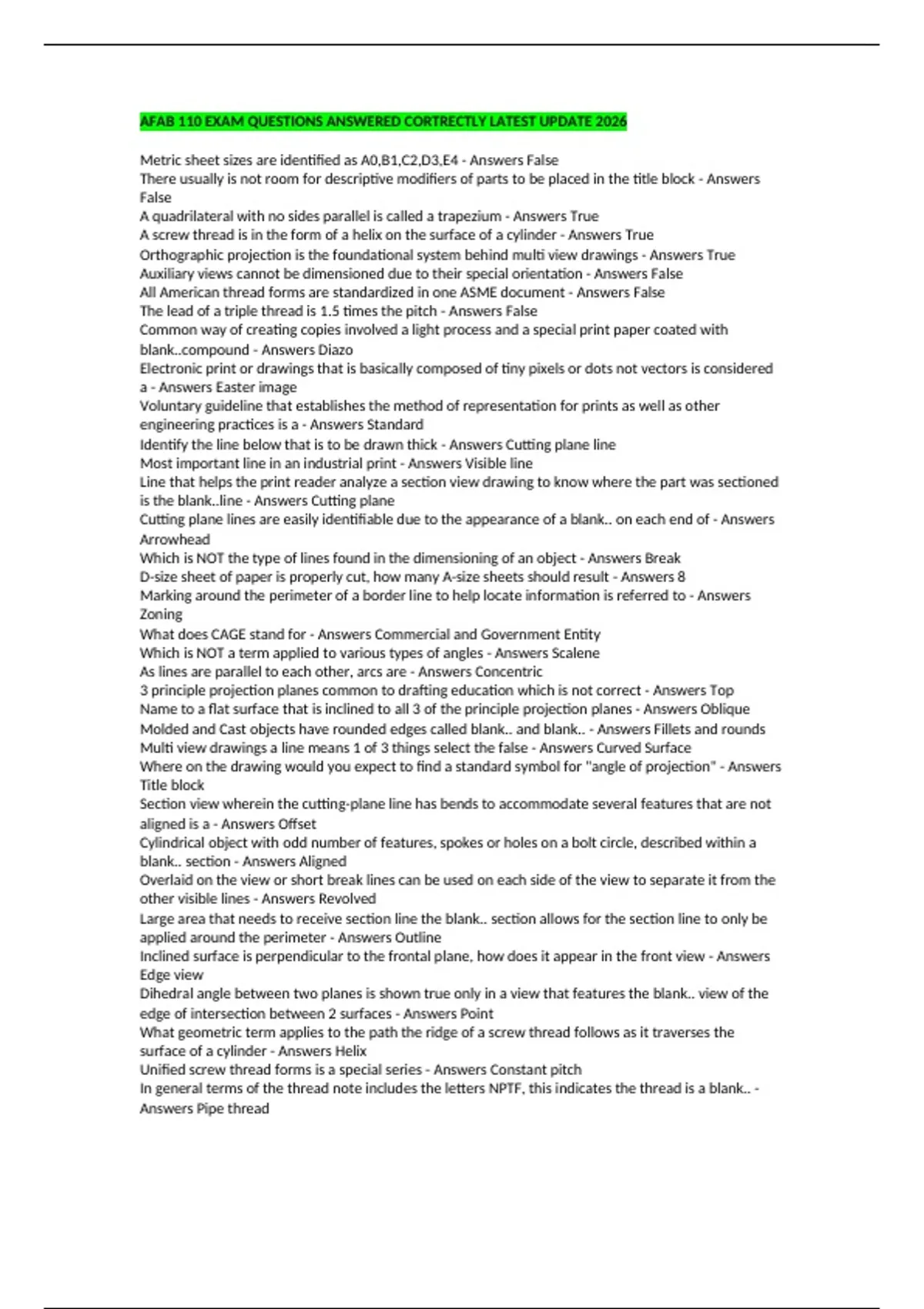 AFAB 110 EXAM QUESTIONS ANSWERED CORTRECTLY LATEST UPDATE 2026 Metric sheet sizes are identified as A0,B1,C2,D3,E4 - Answers False There usually is not room for descriptive modifiers of parts to be placed in the title block - Answers False A quadrilateral with no sides parallel is called a trapezium - Answers True A screw thread is in the form of a helix on the surface of a cylinder - Answers True Orthographic projection is the foundational system behind multi view drawings - Answers True Auxiliary views cannot be dimensioned due to their special orientation - Answers False All American thread forms are standardized in one ASME document - Answers False The lead of a triple thread is 1.5 times the pitch - Answers False Common way of creating copies involved a light process and a special print paper coated with blank..compound - Answers Diazo Electronic print or drawings that is basically composed of tiny pixels or dots not vectors is considered a - Answers Easter image Voluntary guideline that establishes the method of representation for prints as well as other engineering practices is a - Answers Standard Identify the line below that is to be drawn thick - Answers Cutting plane line Most important line in an industrial print - Answers Visible line Line that helps the print reader analyze a section view drawing to know where the part was sectioned is the blank..line - Answers Cutting plane Cutting plane lines are easily identifiable due to the appearance of a blank.. on each end of - Answers Arrowhead Which is NOT the type of lines found in the dimensioning of an object - Answers Break D-size sheet of paper is properly cut, how many A-size sheets should result - Answers 8 Marking around the perimeter of a border line to help locate information is referred to - Answers Zoning What does CAGE stand for - Answers Commercial and Government Entity Which is NOT a term applied to various types of angles - Answers Scalene As lines are parallel to each other, arcs are - Answers Concentric